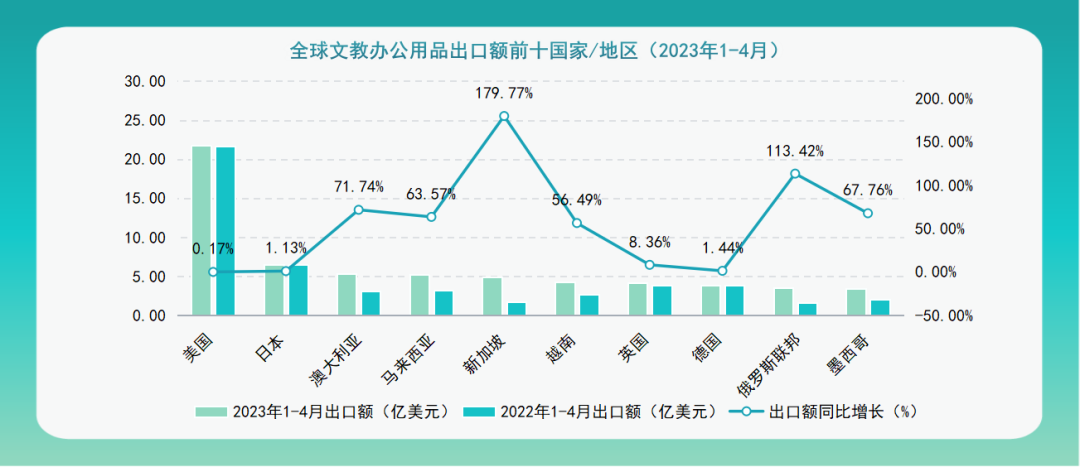 图:全球文教办公用品出口额前十国家/地区(2023年1-4月)