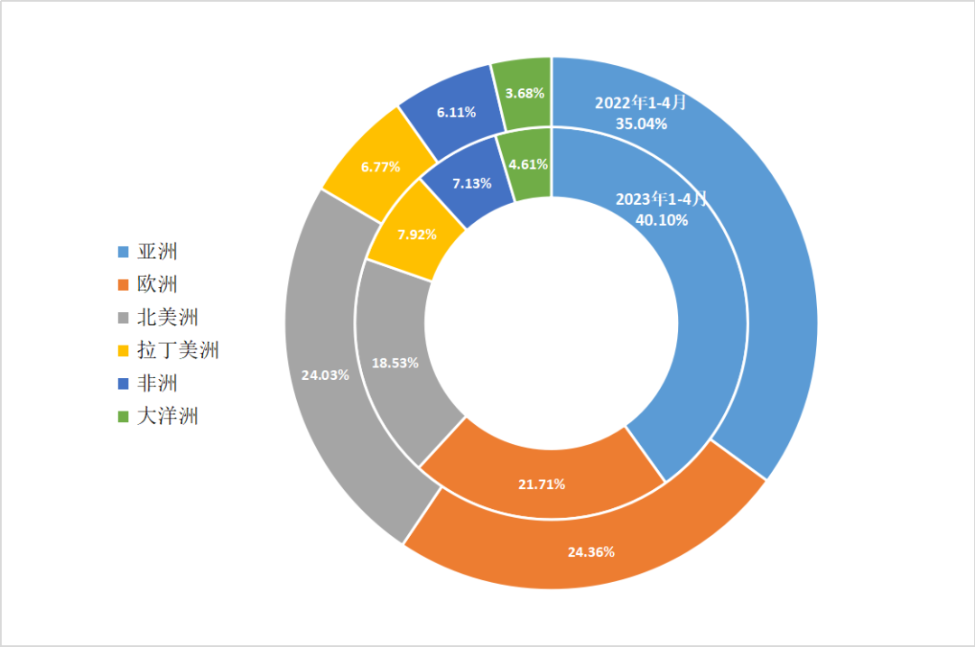 图:2023年1-4月文体用品各大洲占比情况(出口额)