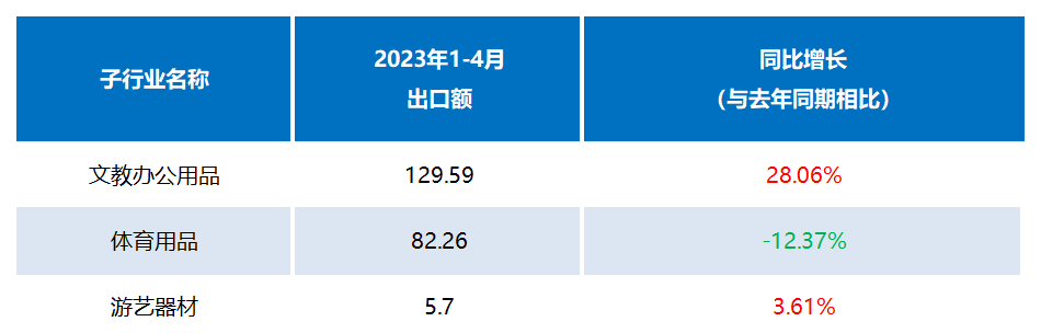 从子行业出口额情况来看,文教办公用品、游艺器材增速继续加快,体育用品降幅有所收窄。
