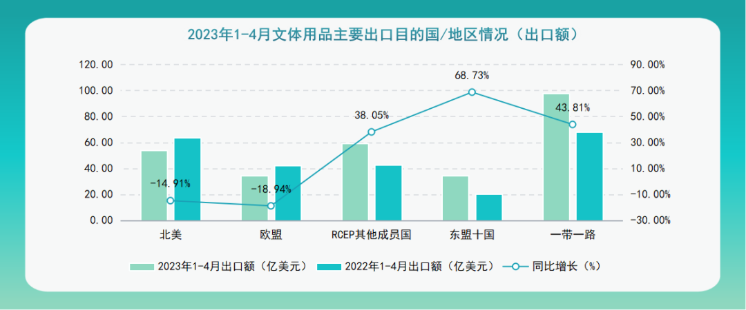 2023年1-4月,我国文体用品对亚洲地区出口额约78亿美元,同比增长41.32%,延续上月增长态势。