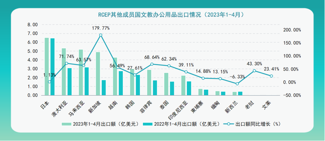 图:RCEP其他成员国文教办公用品出口额前十国家/地区(2023年1-4月)