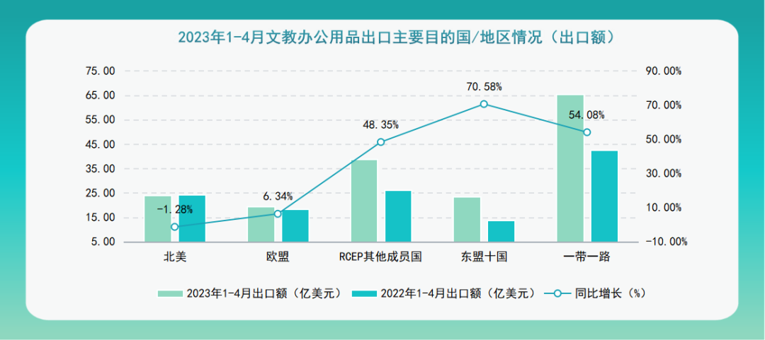我国文教办公用品对“一带一路”沿线国家出口情况稳步向好,出口额约65亿美元,占我国文教办公用品总出口额50.51%,同比增长54.08%;