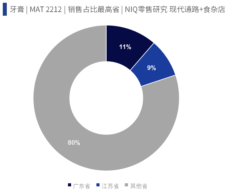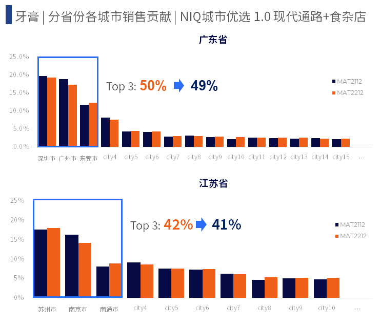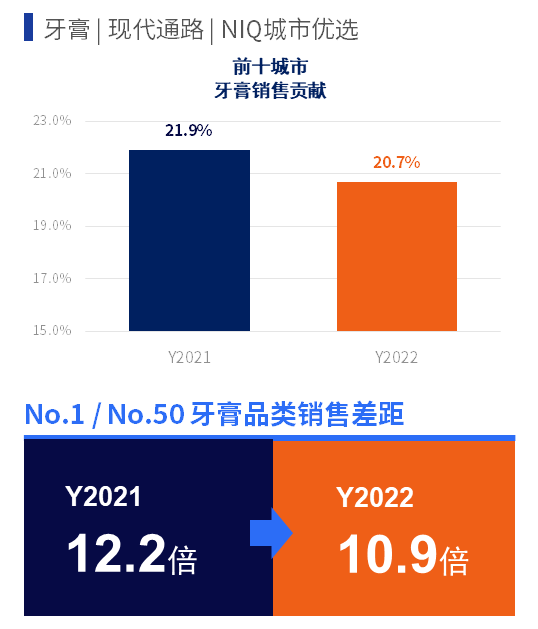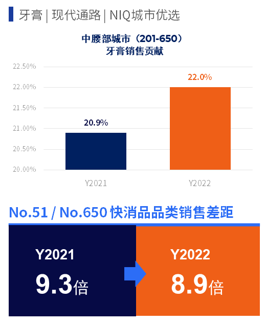 我们以牙膏品类在现代渠道中的销售表现来看,同样地,中腰部城市(即全国排名201名至650名的城市)的累计销售贡献正在增加(20.9%至22%),销售差距正在缓慢拉近。