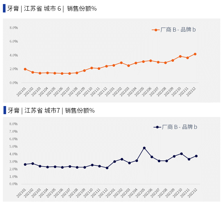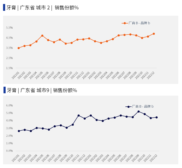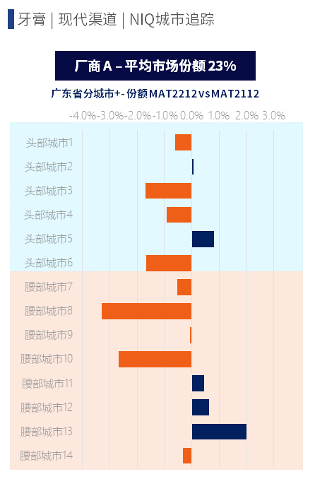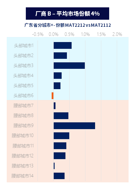 在广东省,A厂商为份额23%的大厂商在头部城市的份额两年对比开始下降,相反在部分腰部城市开始发力,份额开始上升;而B厂商作为份额仅4%的小型厂商则在头部和腰部城市均开始发力,份额开始上升。