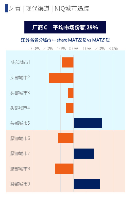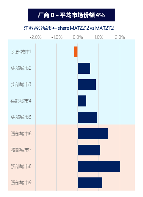在江苏省,我们可以看到份额在29%的厂商C在头部城市的份额也同样有所下跌。与此同时,在部分腰部城市开始发力,在广东省有上升表现的小厂商B在江苏省同样在头部和腰部城市同时发力,均有不错表现。