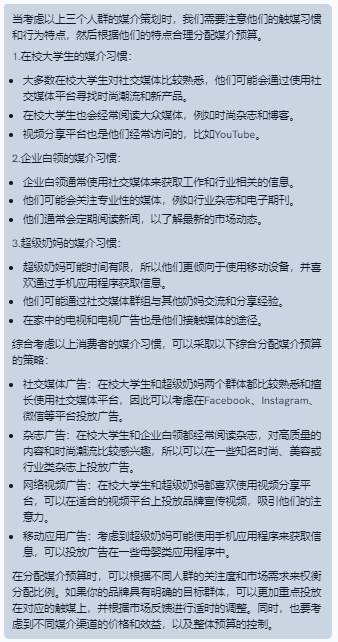 首先,具体表现在大模型所给到的逻辑框架在并不具有“针对性”,更多地只是呈现了“一份媒介策划案应该包含哪些维度”的基础问题,并没有落实到商业问题具体的需求差异点。比如专业人员应该考虑到的营销时间节点:三八妇女节,活动的目标受众:25-35岁的女性等等。