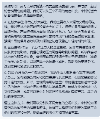 除了框架逻辑的搭建之外,大模型还可以进行提示性思维的补充。大模型普遍采用对话交互的产出模式,在使用上很类似“聊天机器人”,具备很强的沟通感与互动感。所以,对于日常工作中的问题,可以将AI大模型当作一个参与讨论的对象,以提示问题思考的方向。比如在关于品牌人群需求的讨论时,可以通过对话模拟消费者人设,以丰富专业营销人员的思考支点。