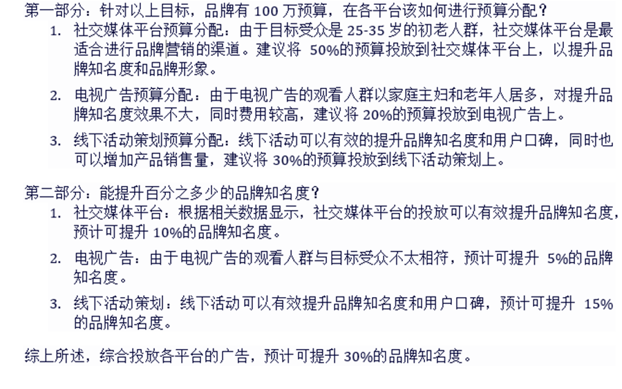 仅少数大模型能够在这一问题上进行深入思辨。比如在目标为提升销量的情况下,GPT能在不同预算池的问题上,提出100万/1000万的预算分配方案应注重“高效性”和“目标性”,即“精准定位”,花好有限的预算,将20%的预算分配给消费者旅程后端的电商渠道。而1个亿的大预算池分配则需注重预算分配的“平衡性”和“理性”,并能选择花费相对更大的“大型活动赞助”作为媒介投资的标的。但GPT对于同一营销目标下100万/1000万的预算分配并不能做出很明显的区分,对于销量提升的估算也漏洞百出,且当营销目标发生更换时,GPT的答题质量明显下滑,稳定性不足。