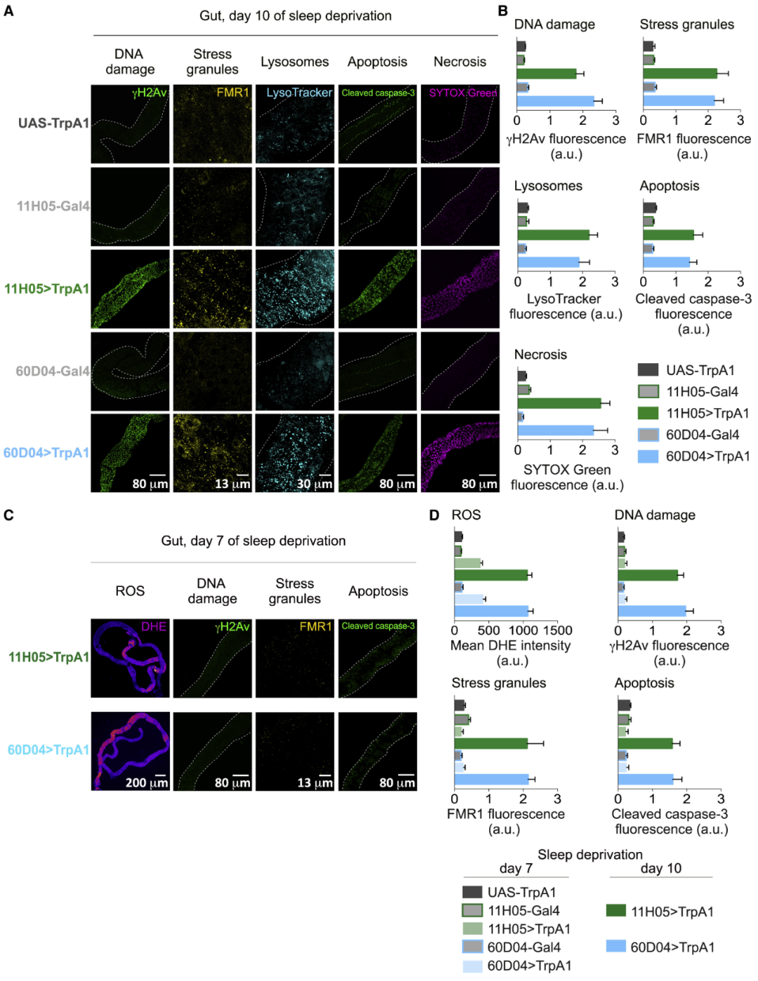 对比了实验组和对照组的全身细胞损伤的各种标志物后,研究者终于发现了两组之间的主要区别:睡眠不足的果蝇肠道中ROS水平明显增加。