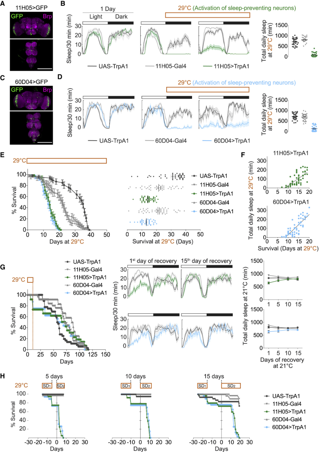 为了回答上述问题,研究者首先在与人类共享许多睡眠调节基因的果蝇上进行了一系列实验。通过对果蝇的神经元进行致热刺激(当温度从21°C上升至29°C时,果蝇体内的热敏蛋白TrpA1处于激活状态,从而刺激神经元,剥夺果蝇的睡眠),果蝇失去了90%的睡眠。