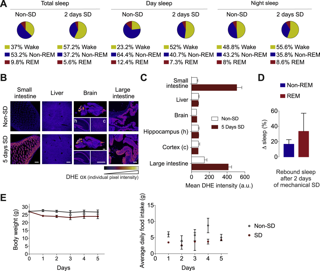在剥夺小鼠睡眠的2天后,小肠内ROS水平明显增加;5天之后,能够在小鼠小肠和大肠中明显检测到DNA损伤、应激颗粒以及细胞死亡标志物。
