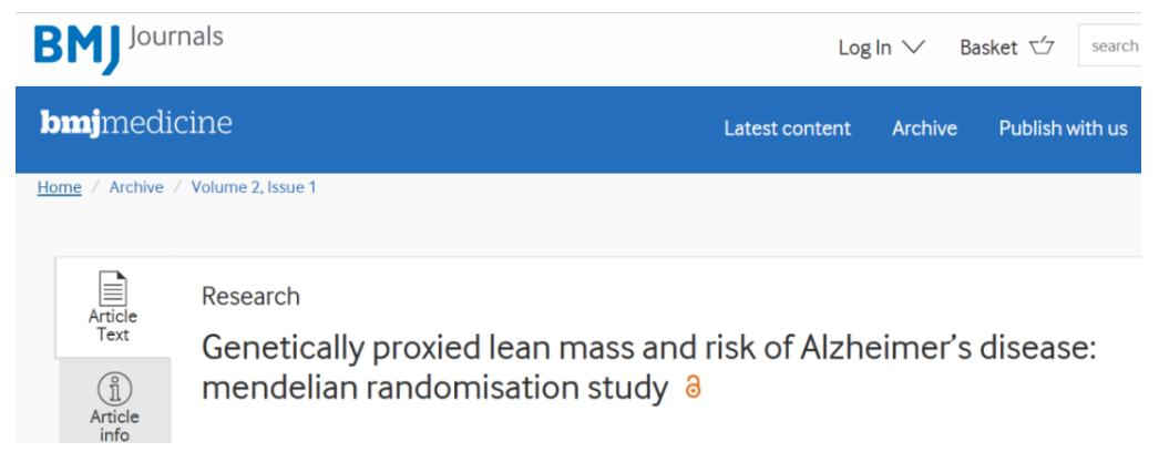 [2]Daghlas I, Nassan M, Gill DGenetically proxied lean mass and risk of Alzheimer’s disease: mendelian randomisation studyBMJ Medicine 2023;2:e000354. doi: 10.1136/bmjmed-2022-000354.