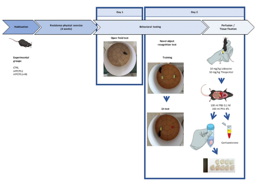 流行病学临床研究表明,长期皮质醇测量的分析可作为阿尔兹海默症患者诊断的生物标志物,抗阻训练对动物来说并不具有应激性,但会降低APP/PS1小鼠的血浆皮质酮水平。由于增加的皮质酮水平会引发BACE1的激活,该酶负责通过淀粉样通路加工APP并形成Aβ肽,该研究推测抗阻训练引起的皮质酮水平下降可能导致APP/PS1小鼠海马Aβ斑块的减少。