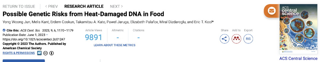 [3]Jun YW, Kant M, Coskun E, Kato TA, Jaruga P, Palafox E, Dizdaroglu M, Kool ET. Possible Genetic Risks from Heat-Damaged DNA in Food. ACS Cent Sci. 2023 Jun 1;9(6):1170-1179. doi: 10.1021/acscentsci.2c01247. PMID: 37396864; PMCID: PMC10311654.