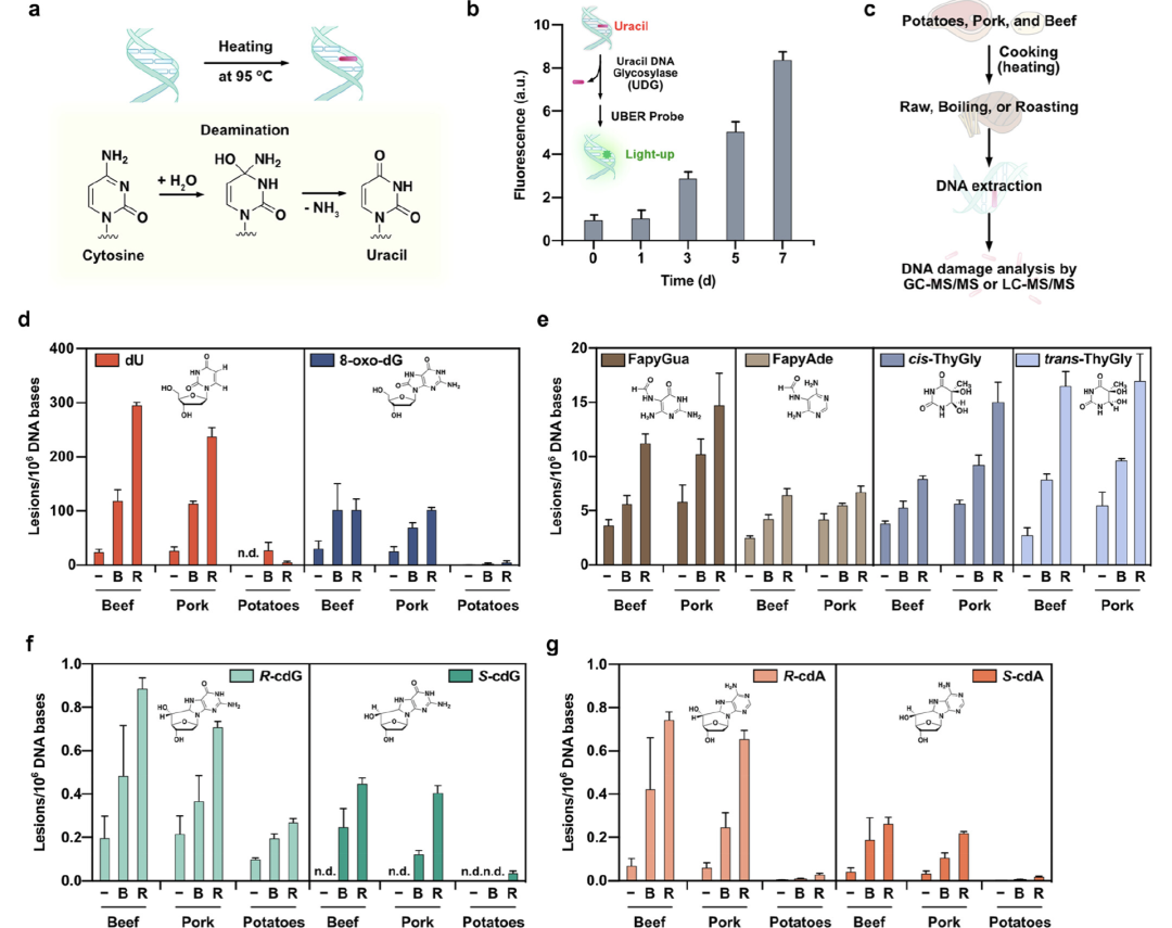 事实上,DNA的体外热稳定性并没有预想中好——维持在95°C的长时间加热,就能加速DNA中胞嘧啶向尿嘧啶转化的脱氨基反应,这也是体外高温引起DNA损伤的最常见形式。然而,烹饪食物的温度往往高于95°C,且加热时间会持续数分钟至数小时不等,这意味着食物中的DNA在高温的洗礼下早已变得“面目全非”。