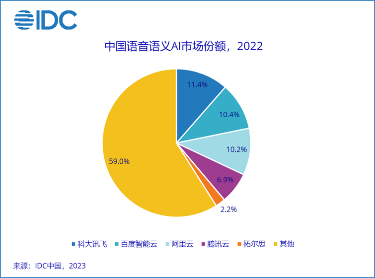 在语音语义AI市场,科大讯飞仍旧位于榜首,但百度智能云、阿里云在不断缩小与科大讯飞的距离。在本次追踪的头部厂商之外,还有很多耕耘在该市场细分领域的厂商,例如华为云、腾讯云、京东科技、追一科技的智能客服;普强信息、声通科技、云知声、思必驰的智能语音等等。该市场中,中长尾的厂商以分散的应用场景或者解决方案占据了59%的市场份额。