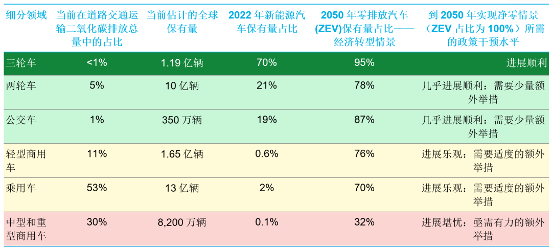 该报告综合分析了全球道路交通运输行业细分领域在实现净零目标上的进展,并指出: