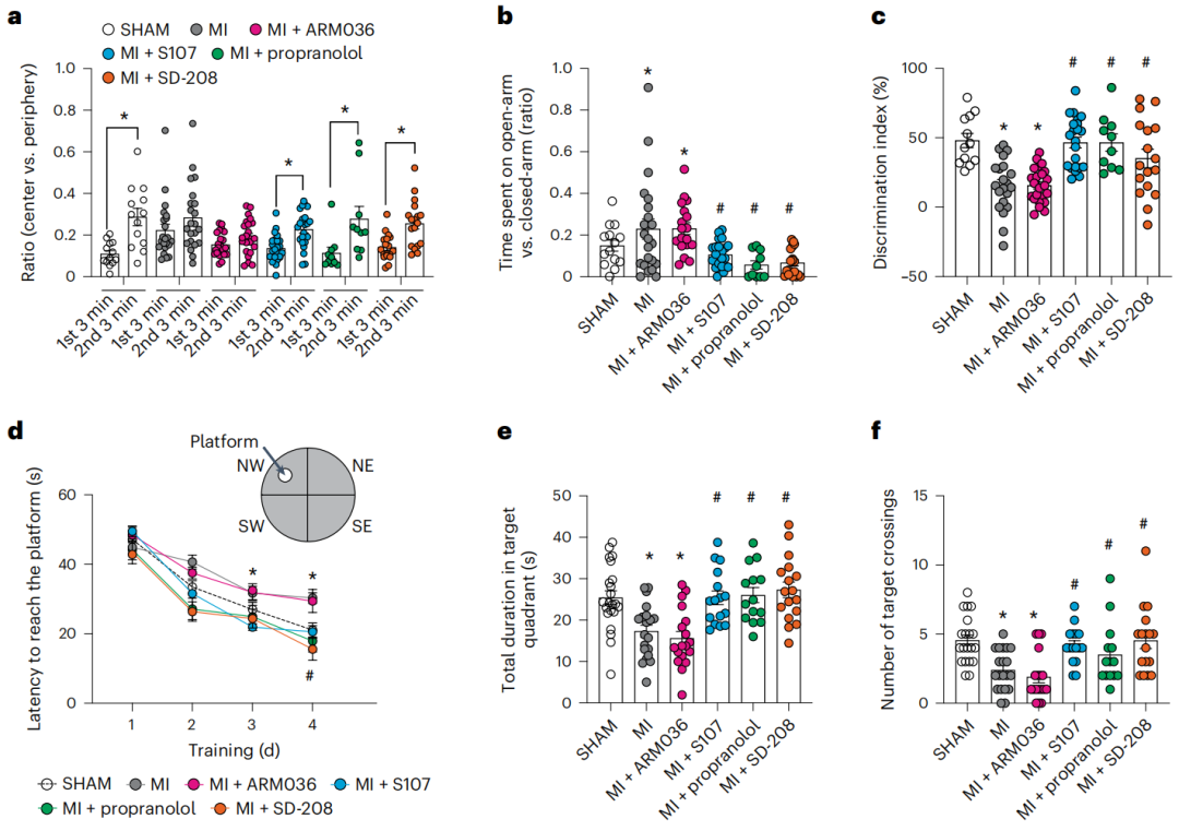 不仅如此,研究者们还采用了另一种Rycal药物进行对比。与S107不同,ARM036虽然也能修复RyR通道,但无法穿过血脑屏障。结果显示,ARM036治疗未能改善心力衰竭小鼠的认知功能。