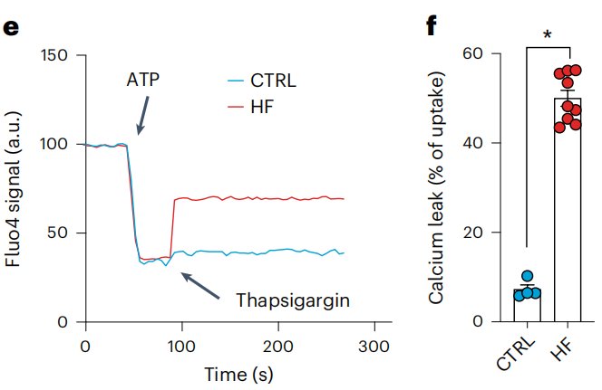 与患者样本的分析结果一致,心力衰竭小鼠的大脑神经元RyR通道表现出同样的异常特征并伴随内质网钙离子泄露。