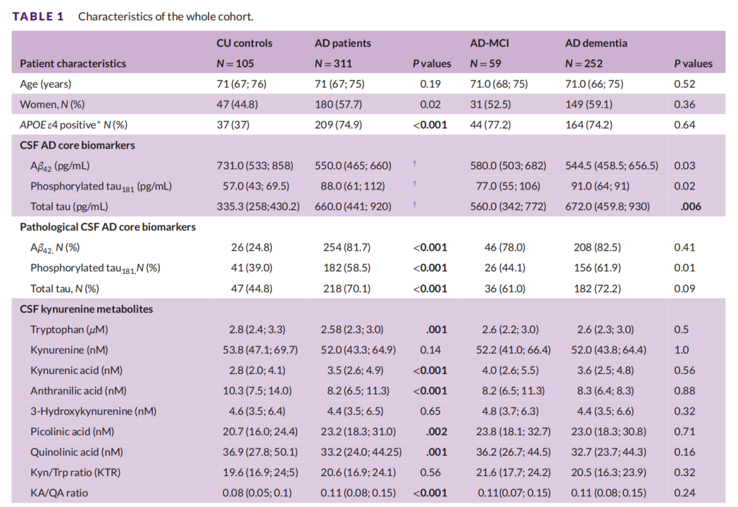 为了弄清楚大脑中,KP代谢物对AD进展的影响,研究从挪威的两家医院中纳入了416名参与者,其中311名是AD患者,105名是认知正常(CU)的对照组。两组人群的中位年龄为71岁,在性别上无显著差异。