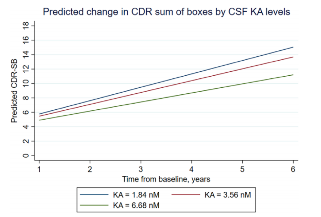 此外,研究还发现,在基线时,脑脊液中KA的较高浓度与AD进展缓慢显著相关(P=0.009)。