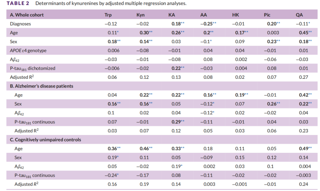 在对整个样本进行多元回归分析时,校正年龄、性别、APOE 4基因型、Aβ42和p-tau181后,研究人员发现,在AD患者中,p-tau181与KA呈正相关(β=0.29,P<0.01),但与其他KP代谢物无关。