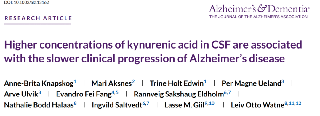 [1]Knapskog AB, Aksnes M, Edwin TH, Ueland PM, Ulvik A, Fang EF, Eldholm RS, Halaas NB, Saltvedt I, Giil LM, Watne LO. Higher concentrations of kynurenic acid in CSF are associated with the slower clinical progression of Alzheimer’s disease. Alzheimers Dement. 2023 Jun 2. doi: 10.1002/alz.13162. Epub ahead of print. PMID: 37264981.