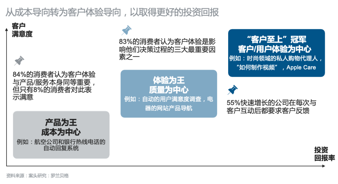 与此同时,我们必须强调企业在追求自动化水平提升的同时,优化客户体验同样至关重要,两者需共同推进。罗兰贝格针对不同企业实践进行分析,发现企业从成本导向转变为客户/用户体验导向的过程中可达成更佳的投资回报率。