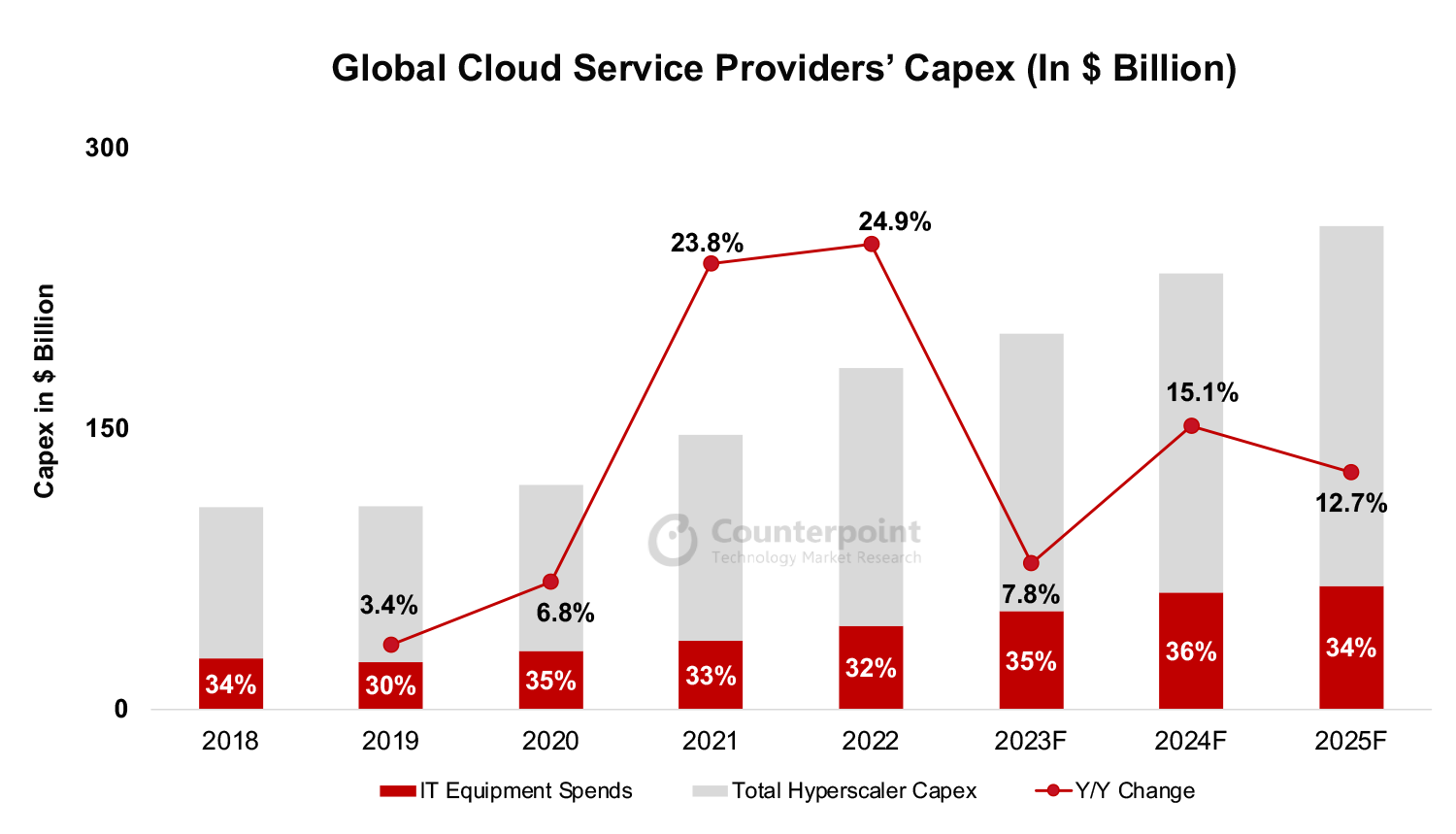 根据Counterpoint的最新研究,2023年全球云服务提供商的资本支出预计将同比增长7.8%。与2022年相比,更高的债务成本、企业支出削减和云收入增长放缓正在影响数据中心的基础设施支出。