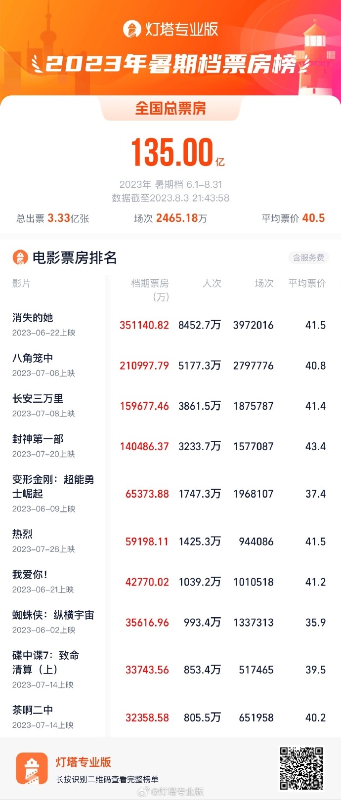 据灯塔专业版实时数据,截至8月3日,2023年暑期档(6月1日-8月31日)总票房(含预售)已突破135亿。 截至8月3日,2023年暑期档共售出电影票3.33亿张,场次2465.18万,平均票价40.5元。电影票房排名方面,《消失的她》凭借35.1亿遥遥领先,位居第一。《八角笼中》排名第二,票房21.1亿。