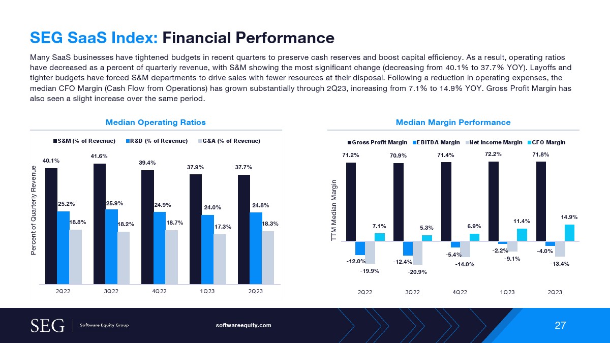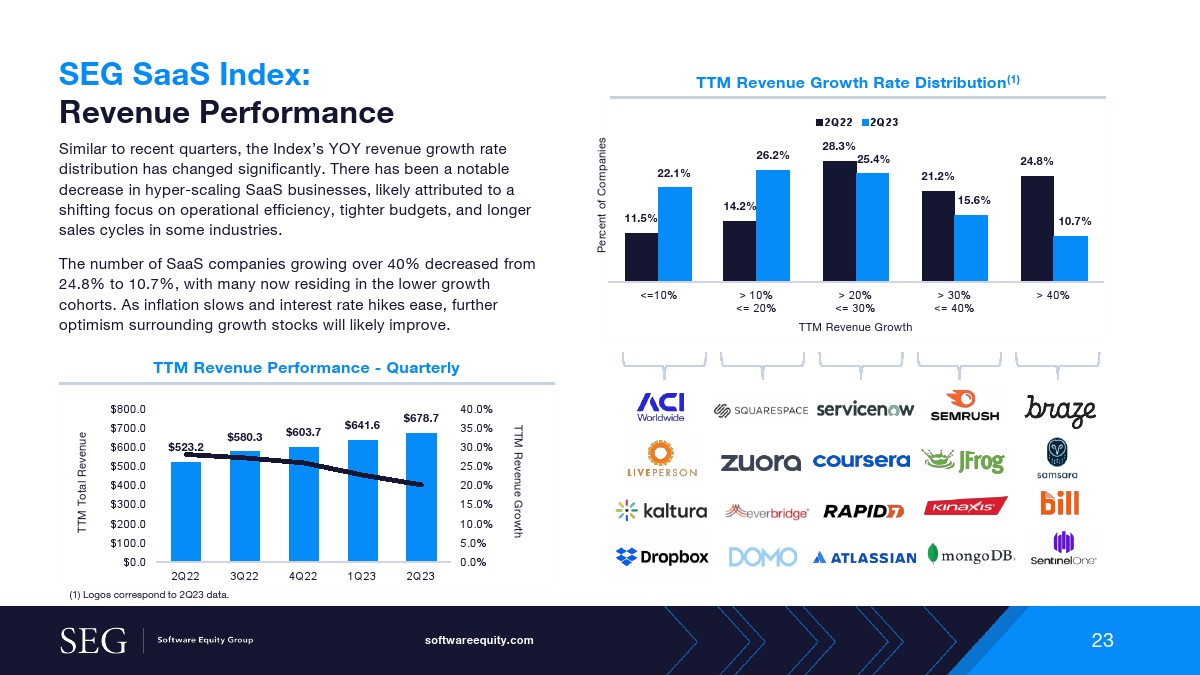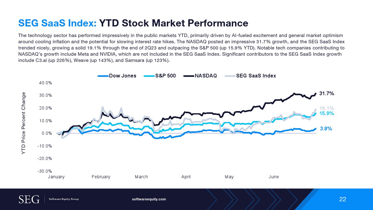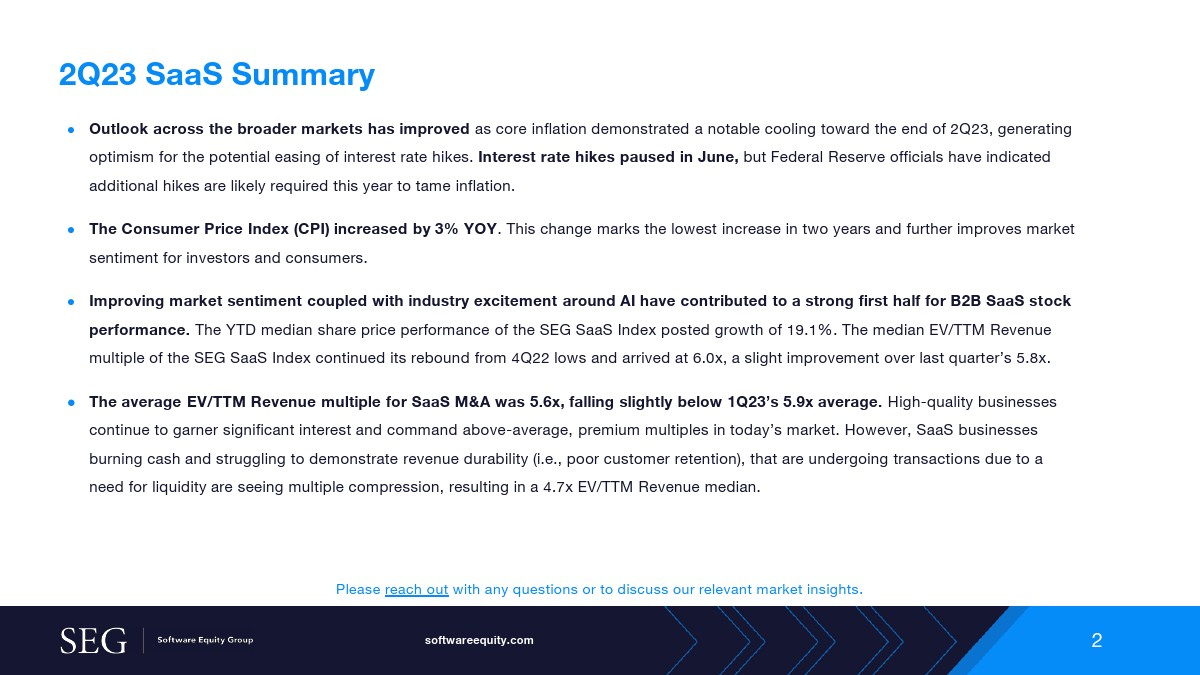 SEG发布了“2023年第二季度 SaaS报告”。随着通胀在2023年第二季度末明显降温,整个市场的前景有所改善,这引发了人们对可能放松加息的乐观情绪。6月份暂停了加息,但美联储官员表示,今年可能需要进一步加息以抑制通胀。