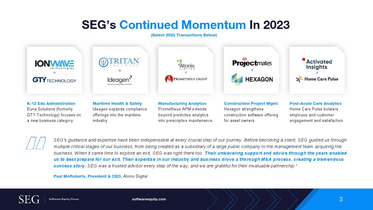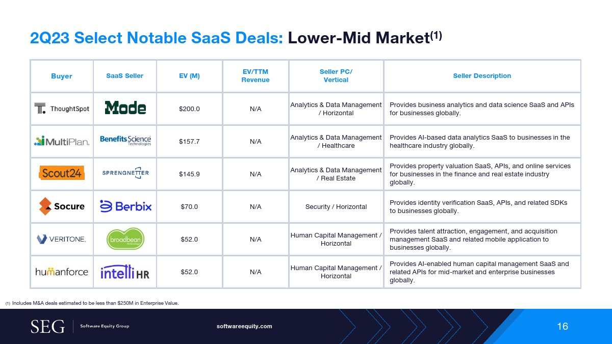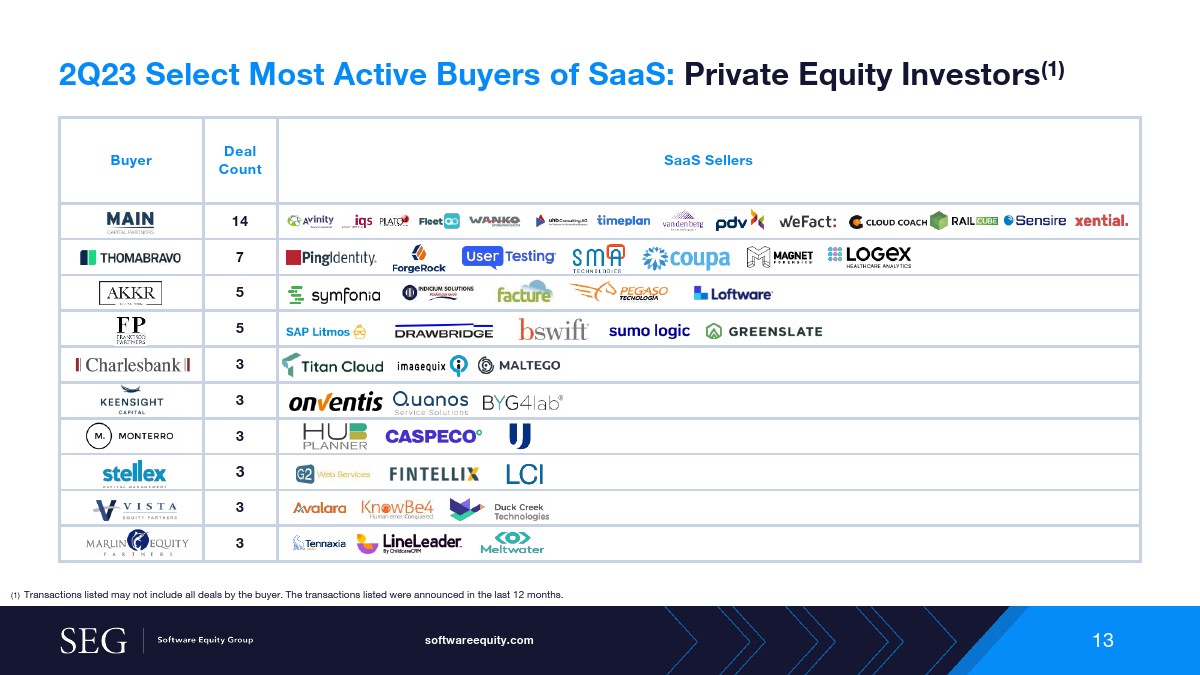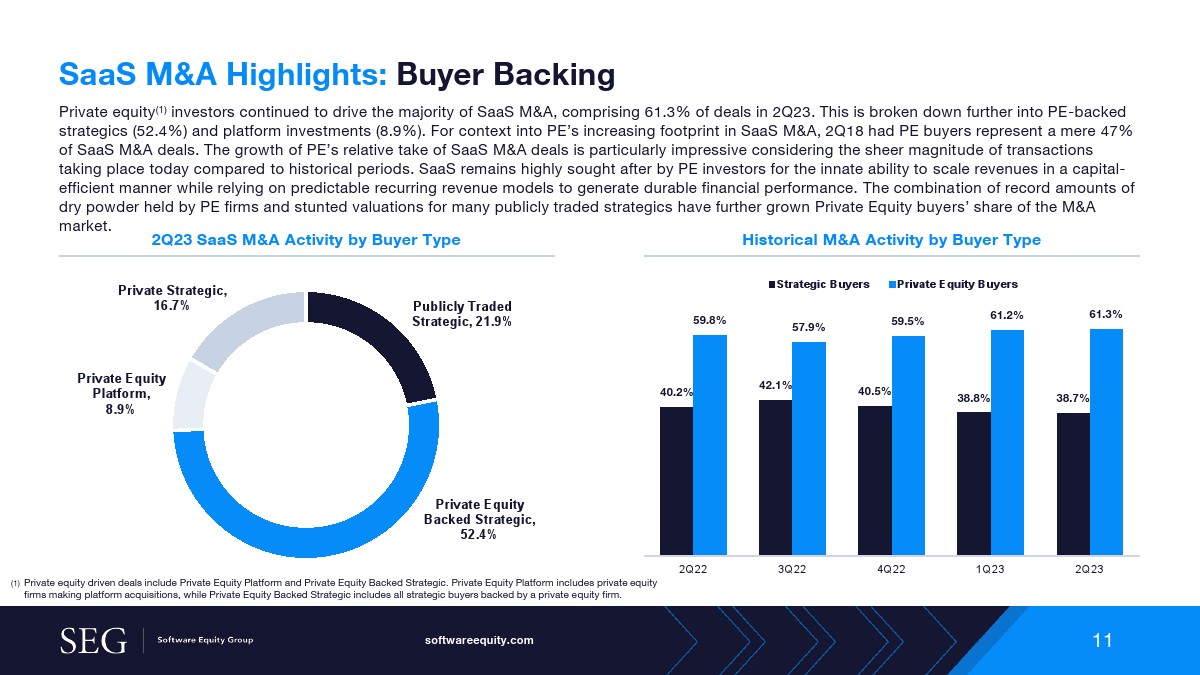 私募股权对SaaS并购的兴趣仍然很高,占2023年第二季度交易的大多数(61.3%)。私募基金支持的战略投资占交易的52.4%,私募基金平台投资占8.9%。