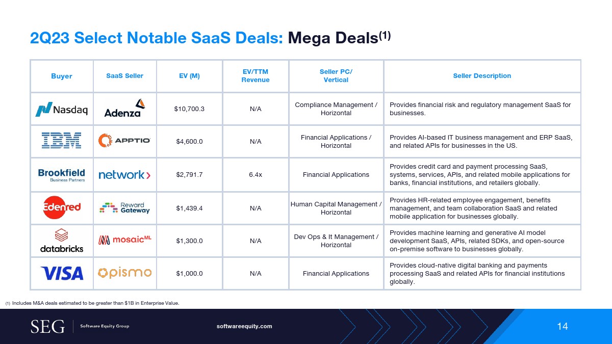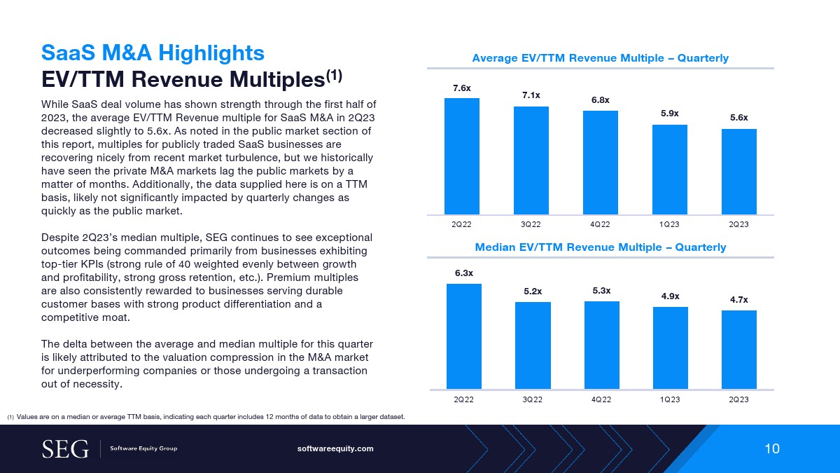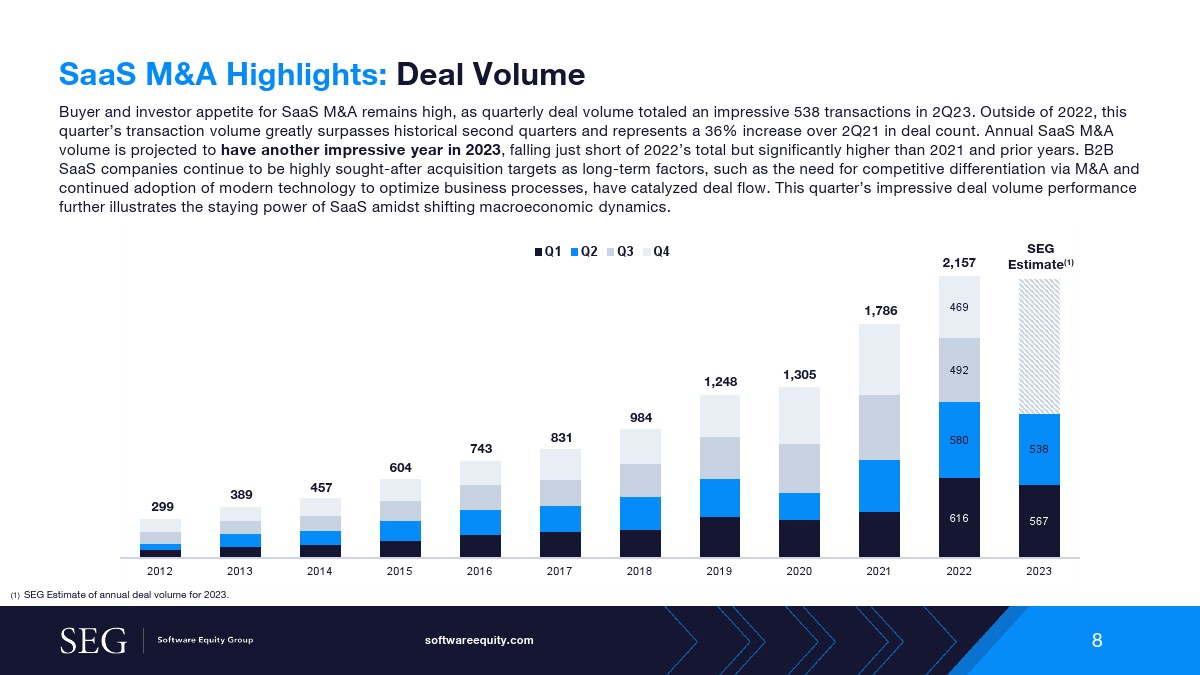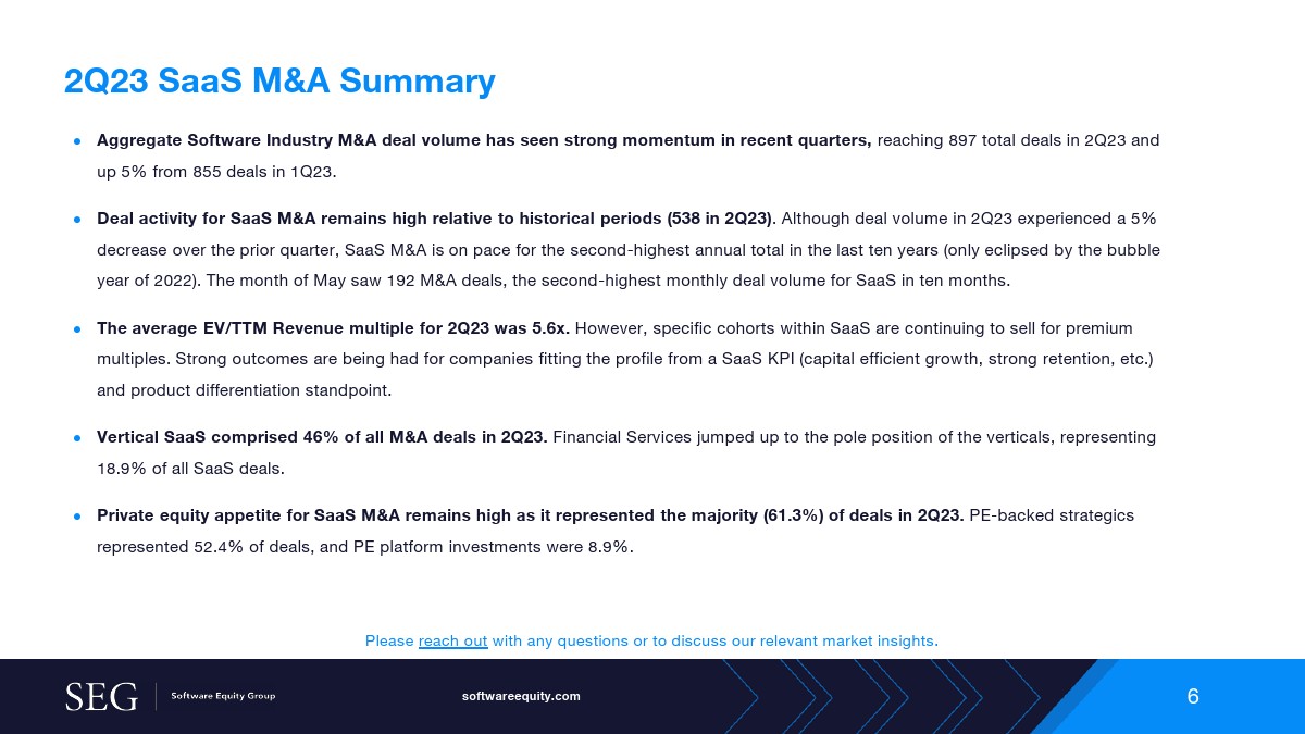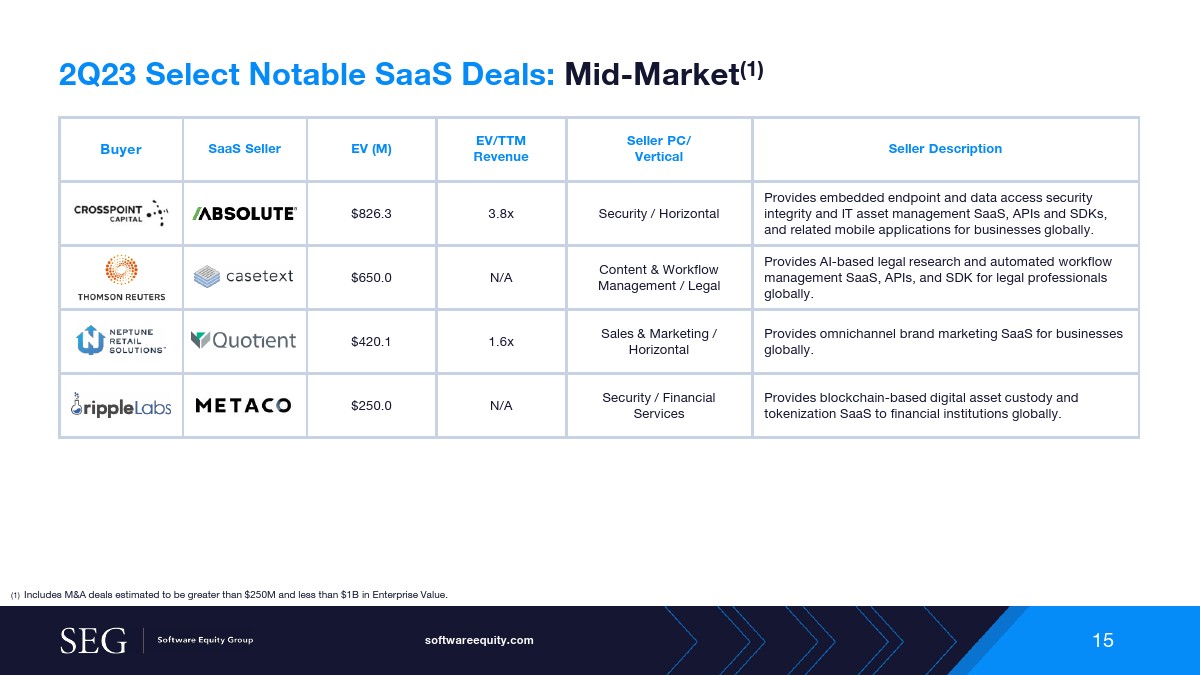 与历史时期相比,SaaS的并购交易活跃度仍然很高(2023年第二季度为538笔)。尽管2023年第二季度的交易量比上一季度下降了5%,但SaaS并购的年度总额仍是过去十年中第二高的。5月份有192笔并购交易,是近10个月SaaS月度交易量第二高的月份。