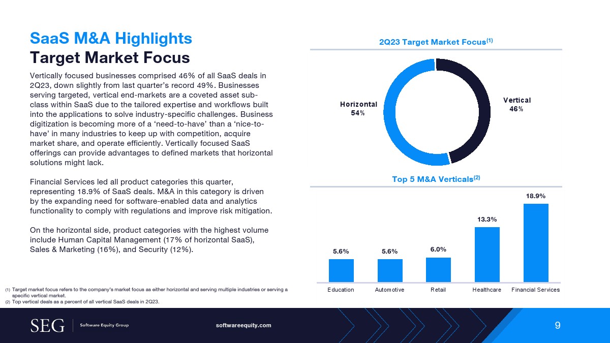 2023年第二季度,垂直SaaS占所有并购交易的46%。金融服务跃升至垂直行业的榜首,占所有SaaS交易的18.9%。