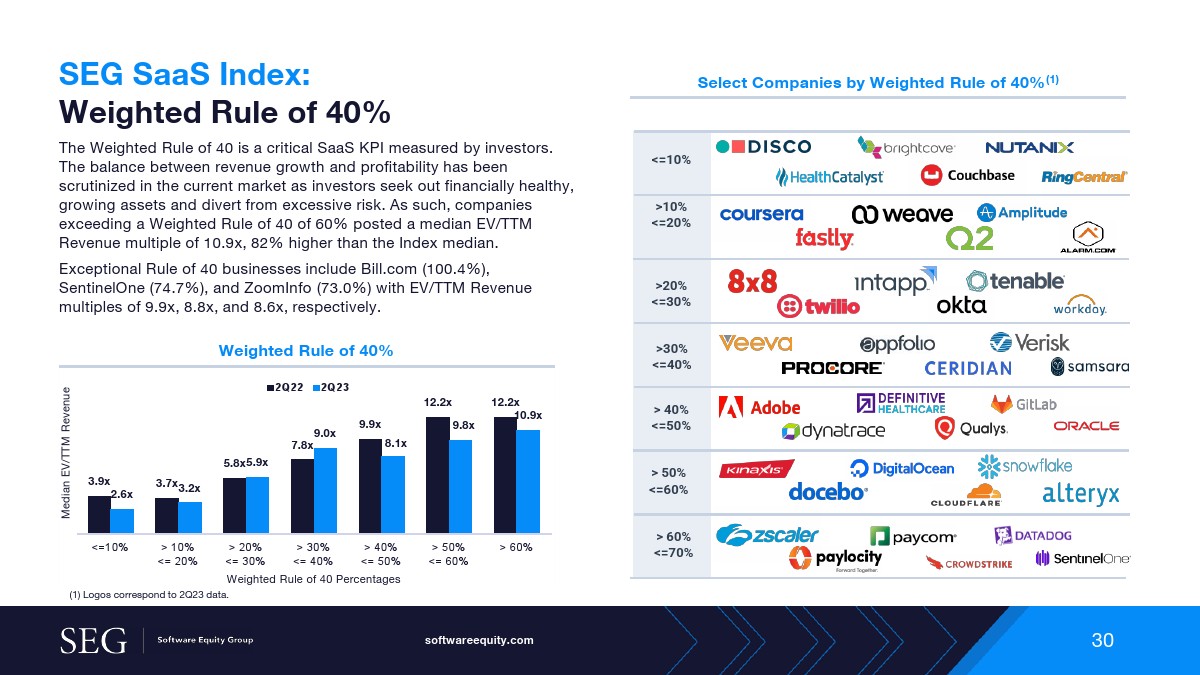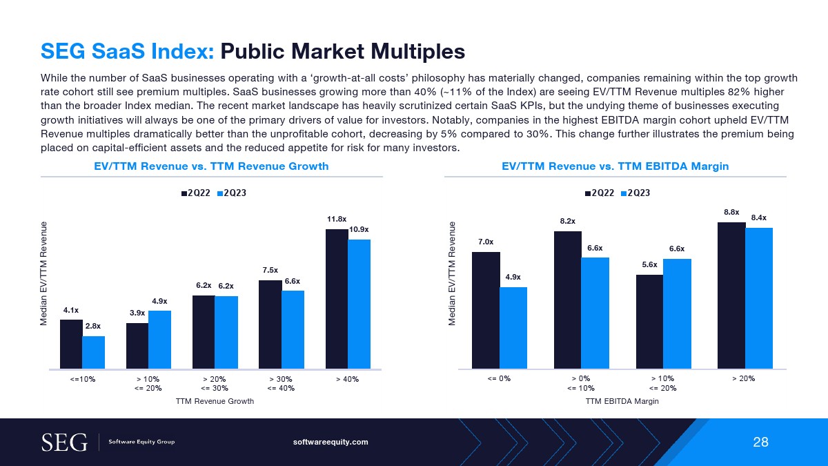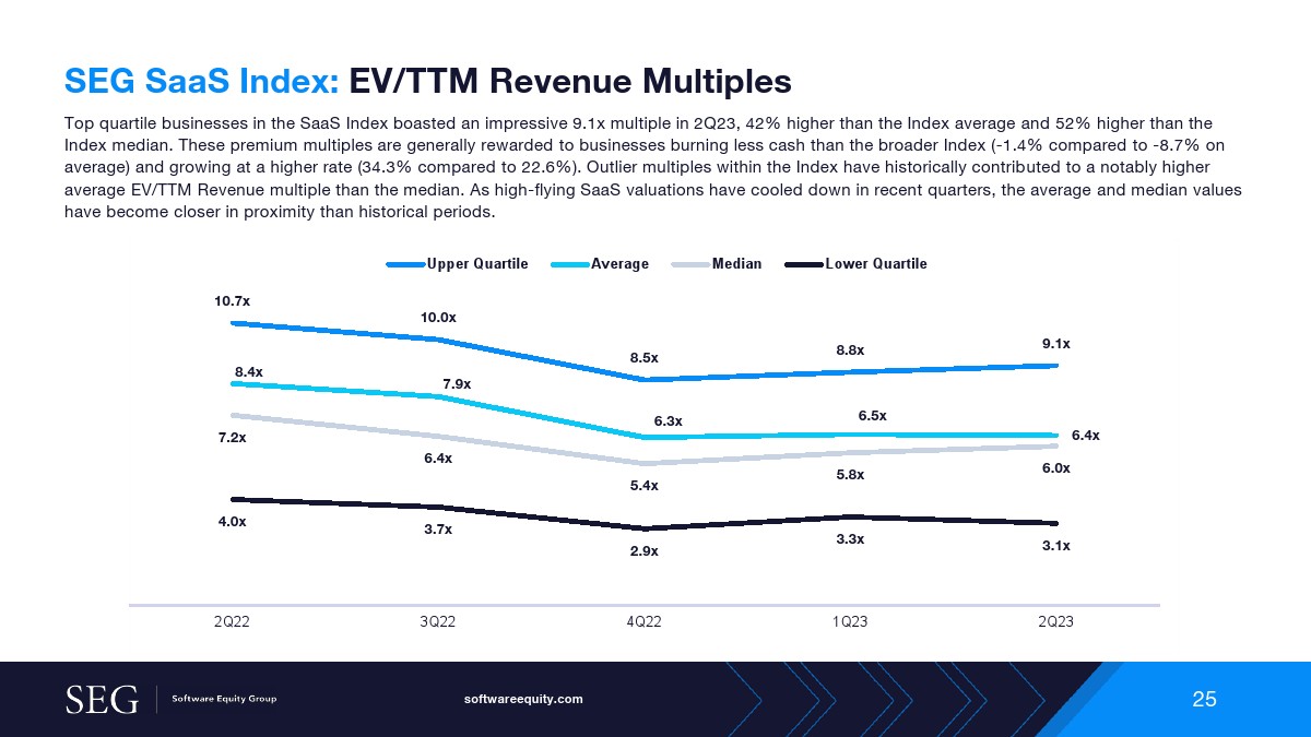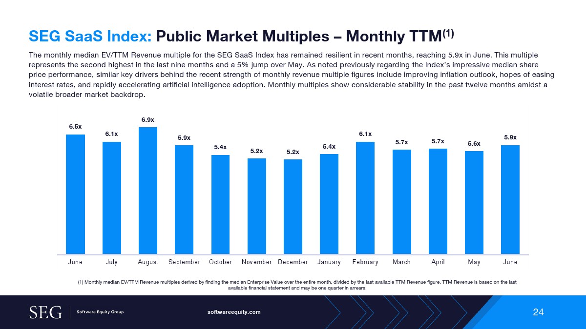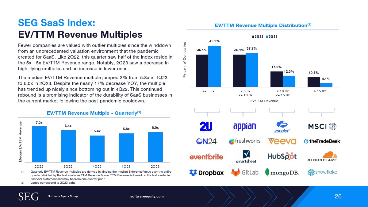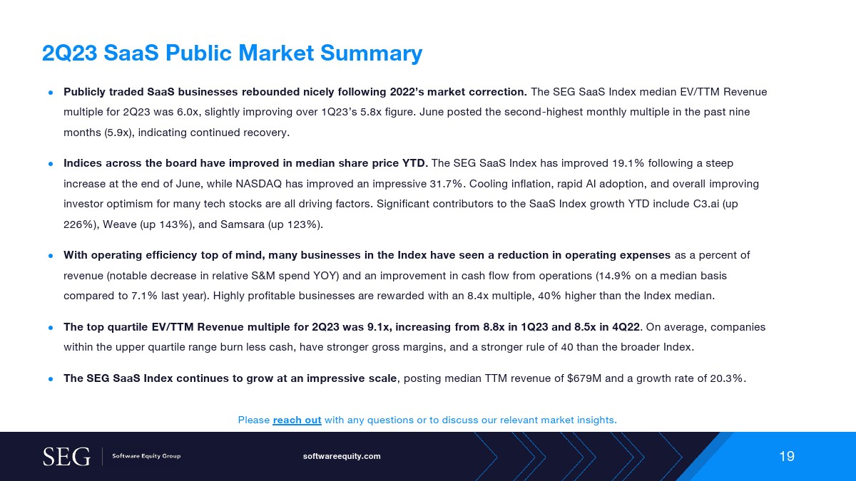 市场情绪的改善,加上业界对人工智能的兴奋,促成了B2B SaaS股票上半年的强劲表现。今年至今,SEG SaaS指数的股价中位数增长了19.1%。SEG SaaS指数的EV/TTM收入倍数中值继续从22年第四季度的低点反弹,达到6倍,比上一季度的5.8倍略有改善。