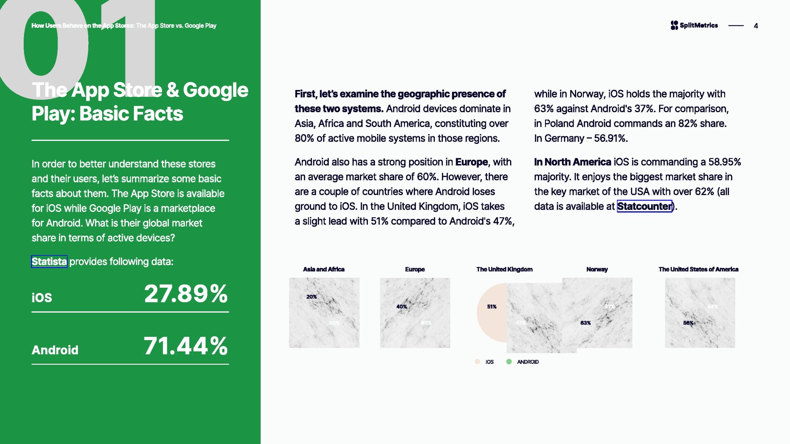 首先,让我们检查一下这两个系统的地理分布。Android设备在亚洲、非洲和南美占据主导地位,占这些地区活跃移动系统的80%以上。