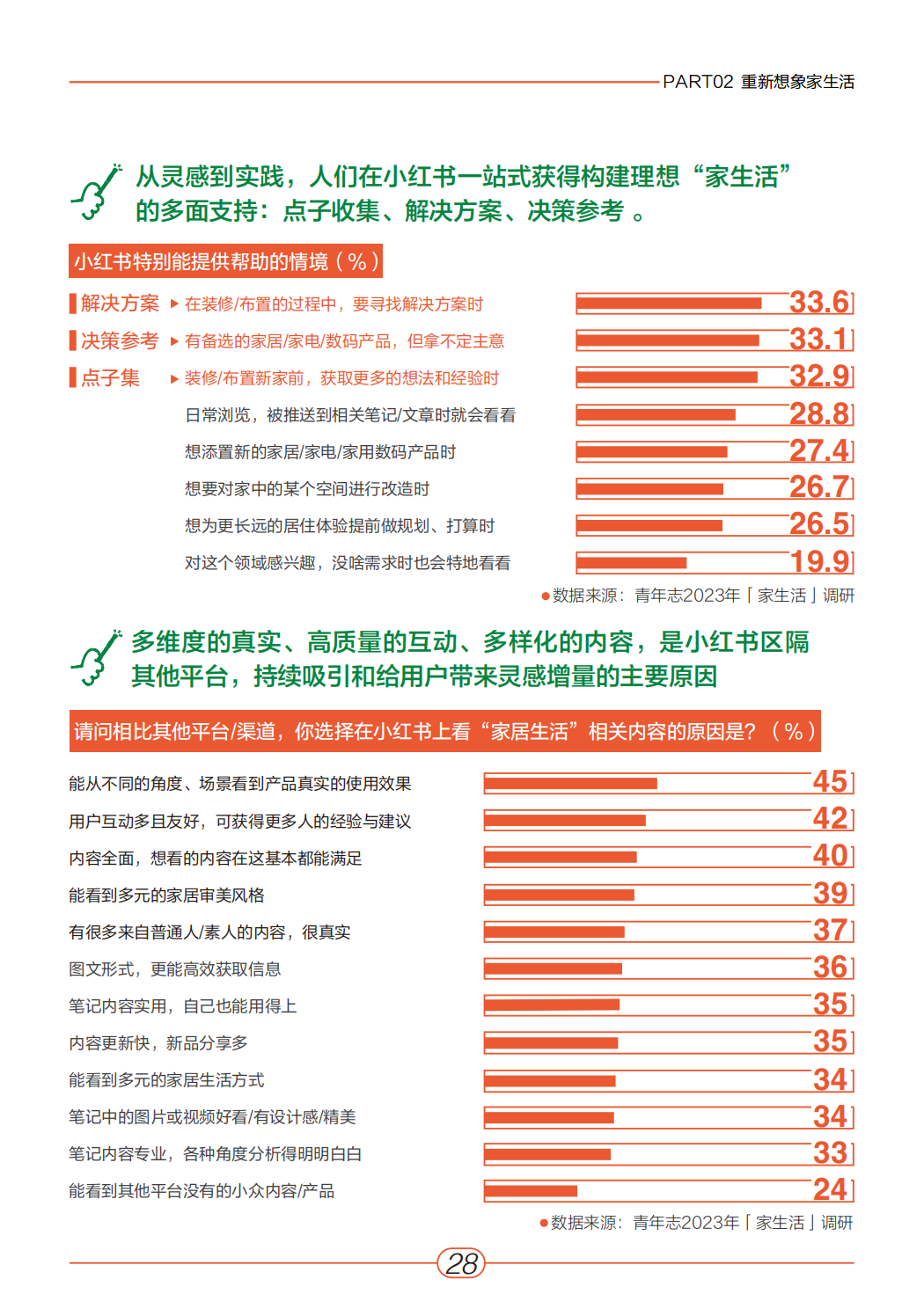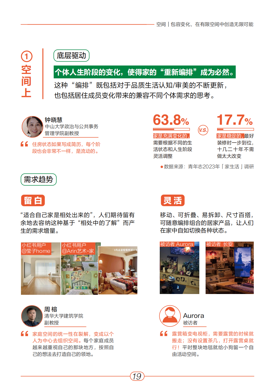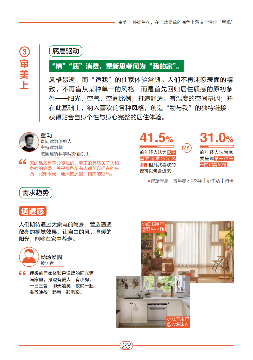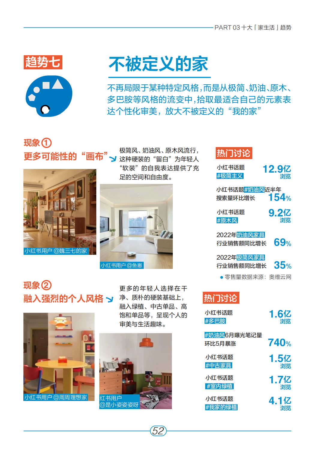 本报告总结的 2023 年度「家生活」趋势,结合了小红书社区对年轻人趋势的挖掘,1600 份覆盖 1-3 线 18-35 岁年轻人的线上定量问卷,新锐青年的「家生活」实践洞察,和学界专家及青年志、安邸、奥维云网等专业机构对青年家居文化与消费的深入研究,力求展现具备深度与广度、生动立体、又兼具行业启发性的「家生活」趋势报告。