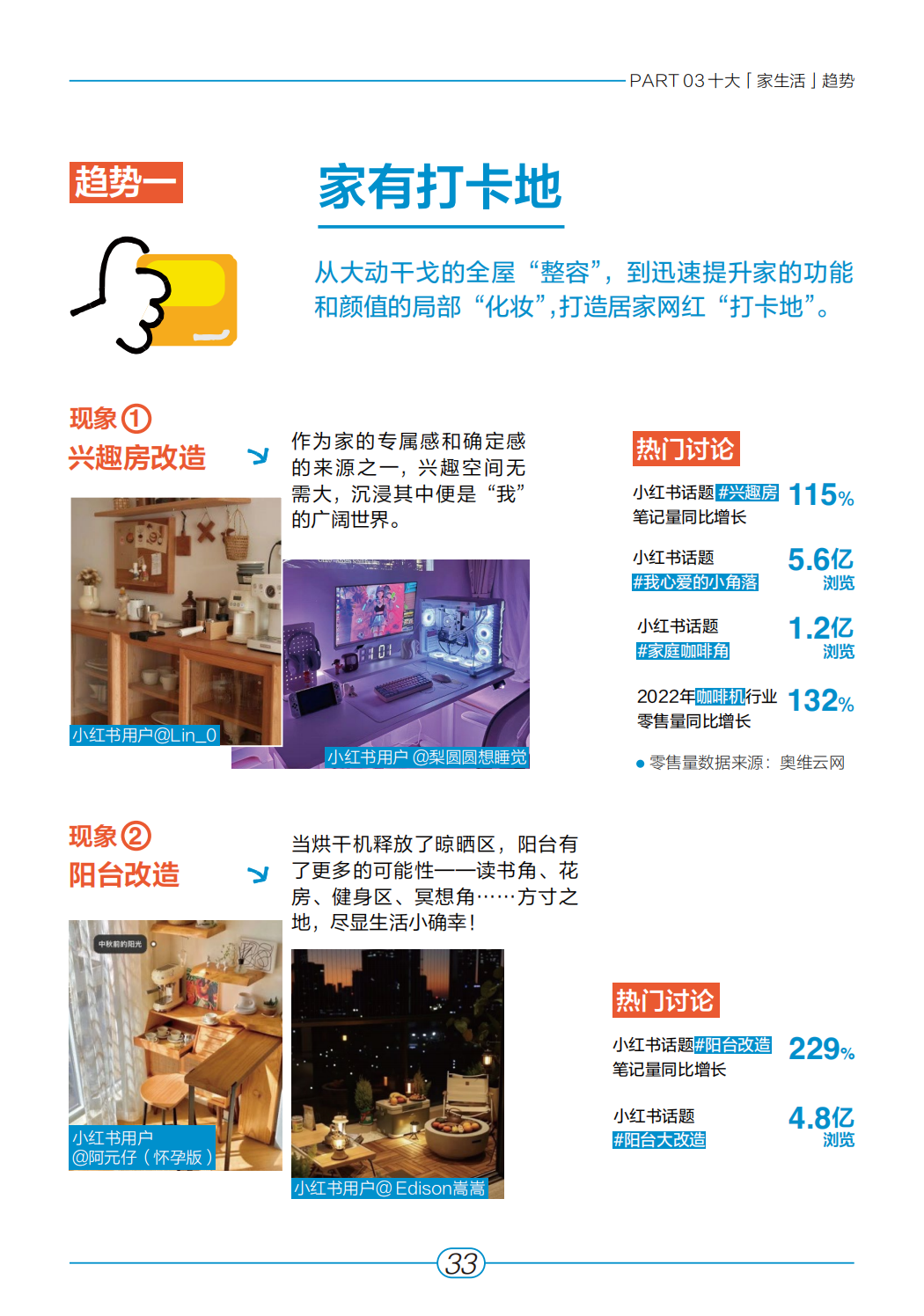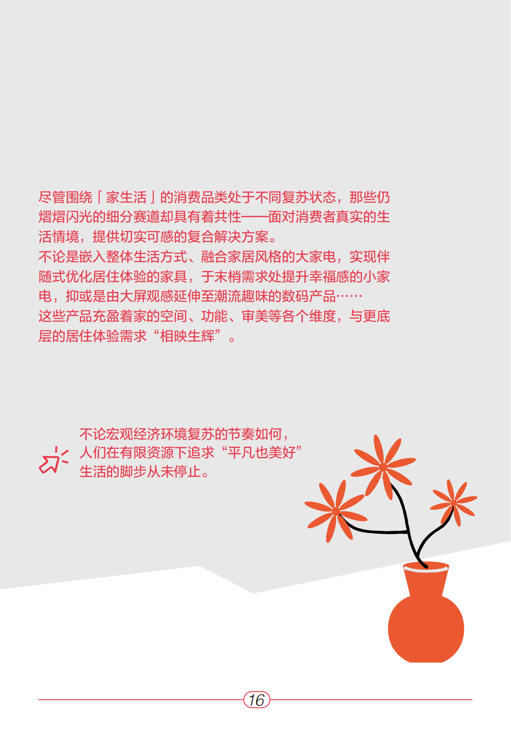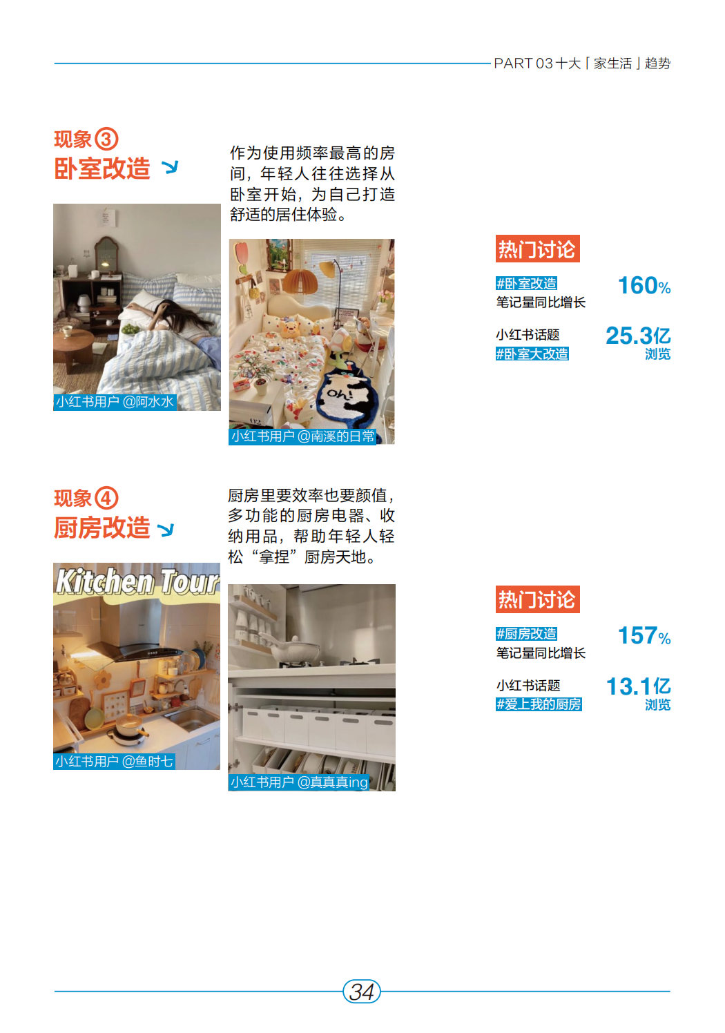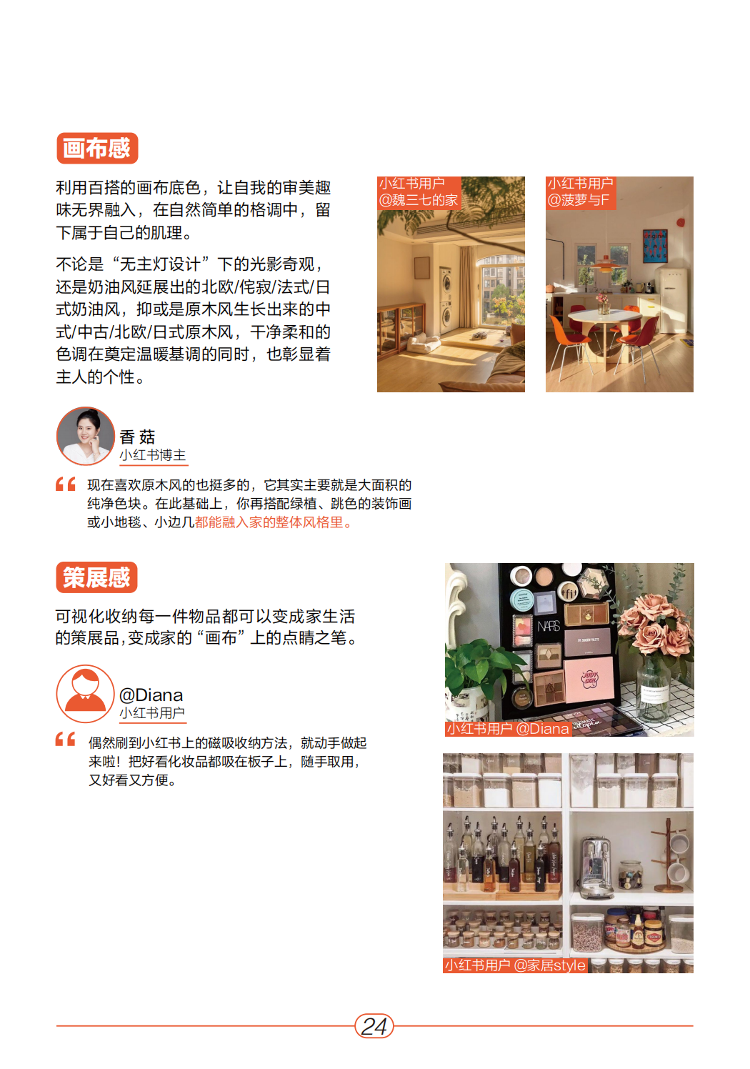 本报告总结的 2023 年度「家生活」趋势,结合了小红书社区对年轻人趋势的挖掘,1600 份覆盖 1-3 线 18-35 岁年轻人的线上定量问卷,新锐青年的「家生活」实践洞察,和学界专家及青年志、安邸、奥维云网等专业机构对青年家居文化与消费的深入研究,力求展现具备深度与广度、生动立体、又兼具行业启发性的「家生活」趋势报告。