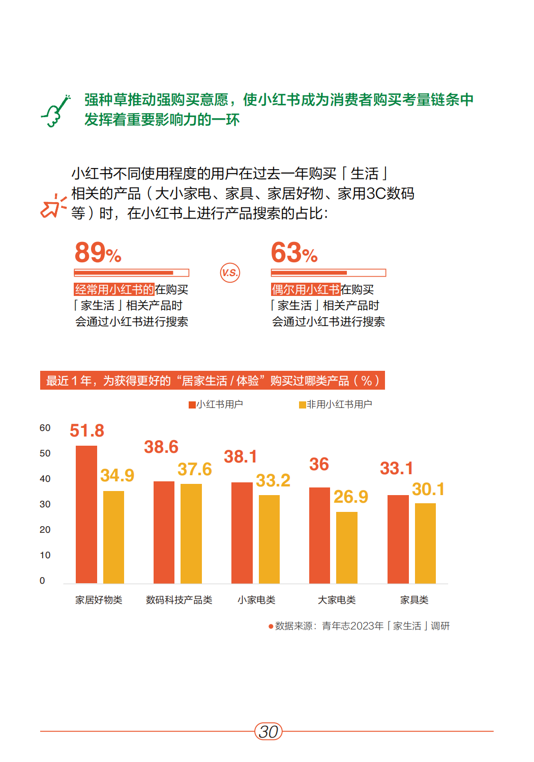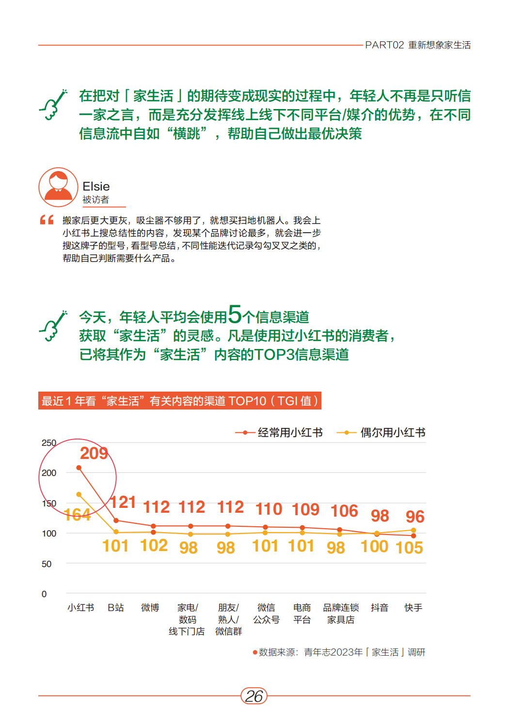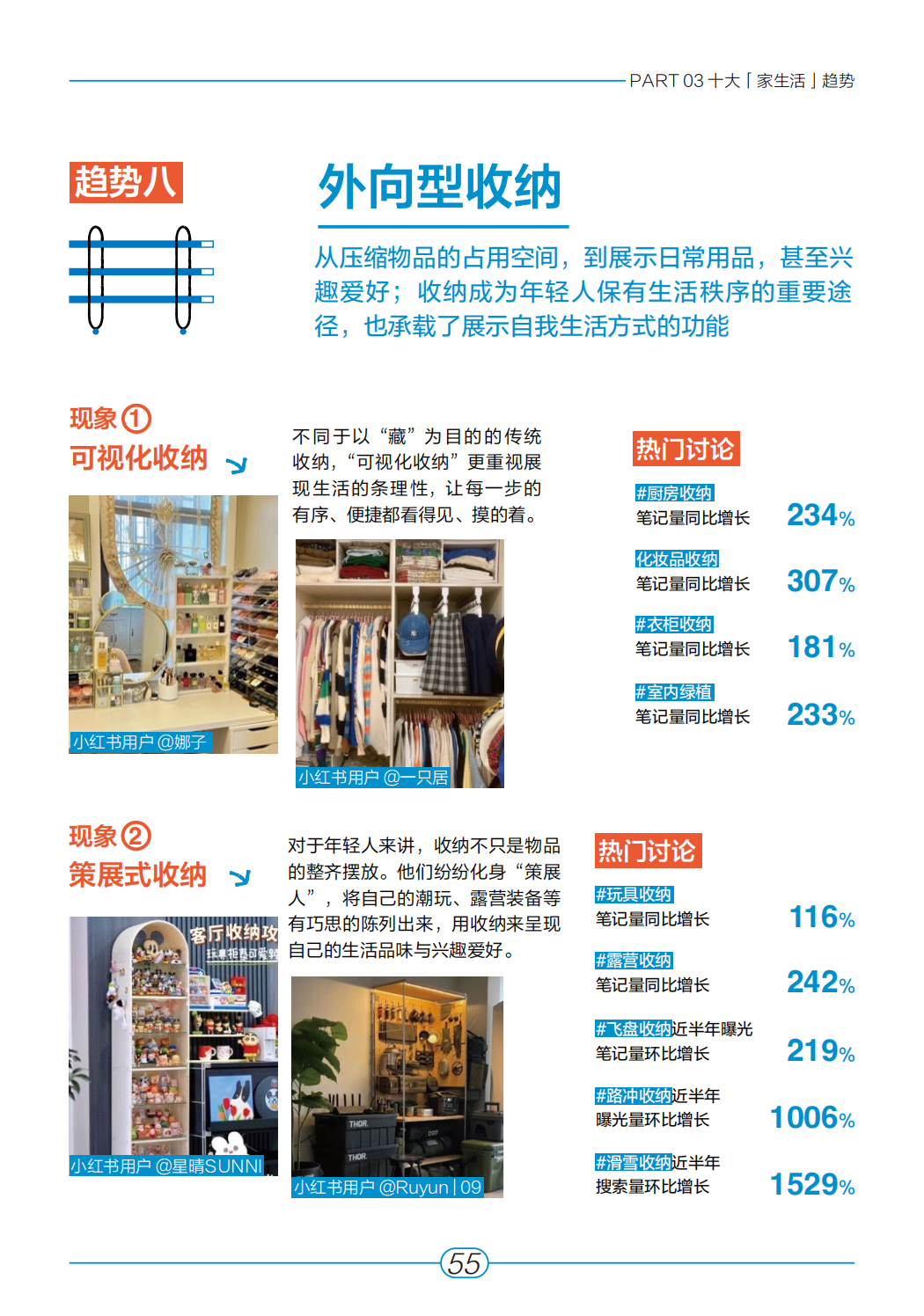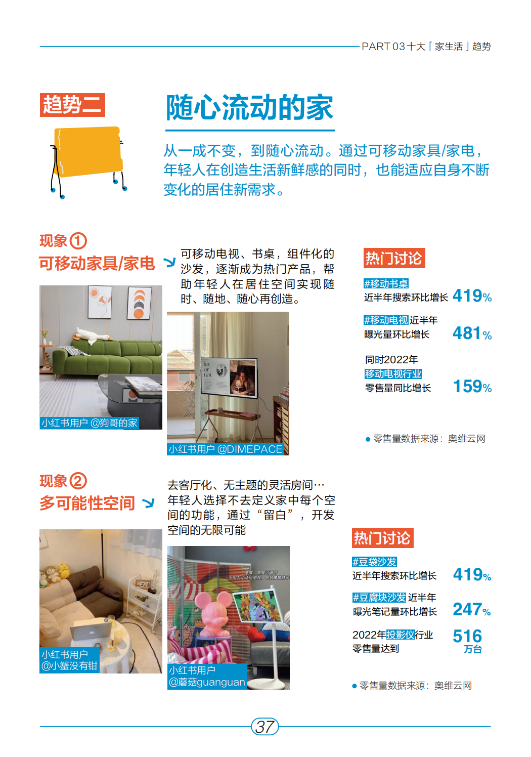 本报告总结的 2023 年度「家生活」趋势,结合了小红书社区对年轻人趋势的挖掘,1600 份覆盖 1-3 线 18-35 岁年轻人的线上定量问卷,新锐青年的「家生活」实践洞察,和学界专家及青年志、安邸、奥维云网等专业机构对青年家居文化与消费的深入研究,力求展现具备深度与广度、生动立体、又兼具行业启发性的「家生活」趋势报告。