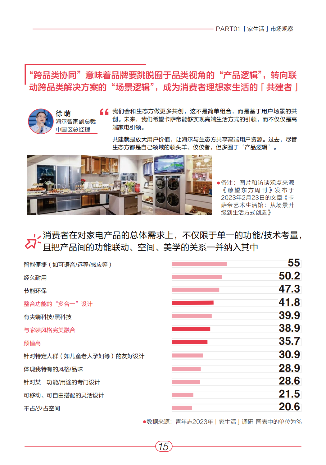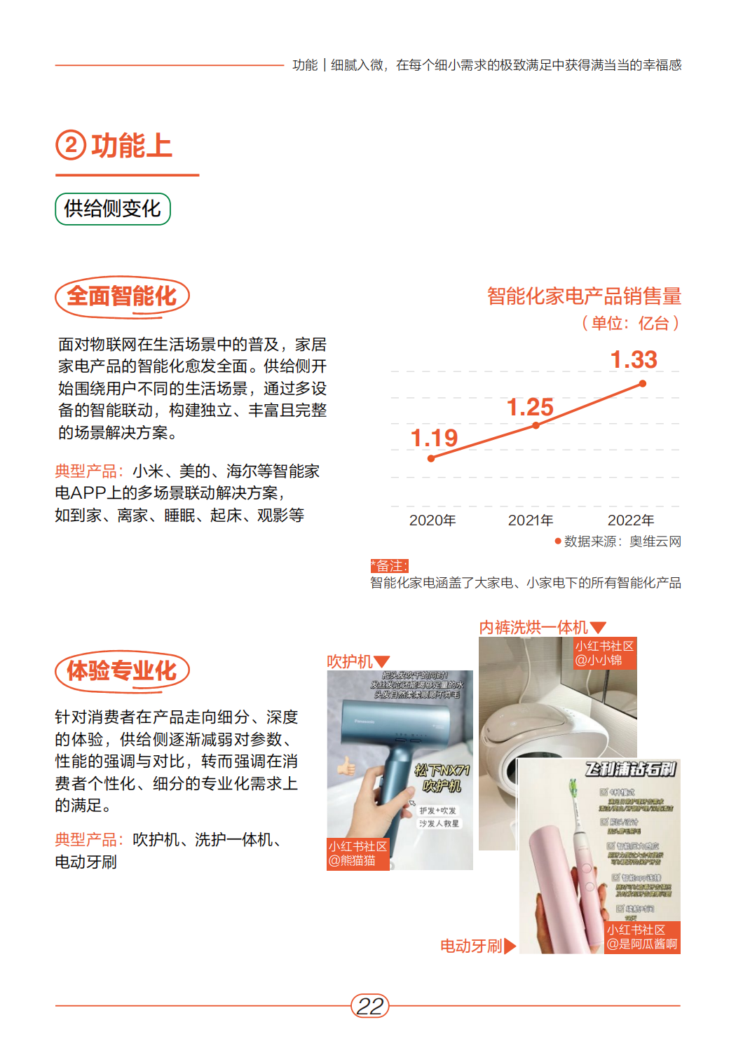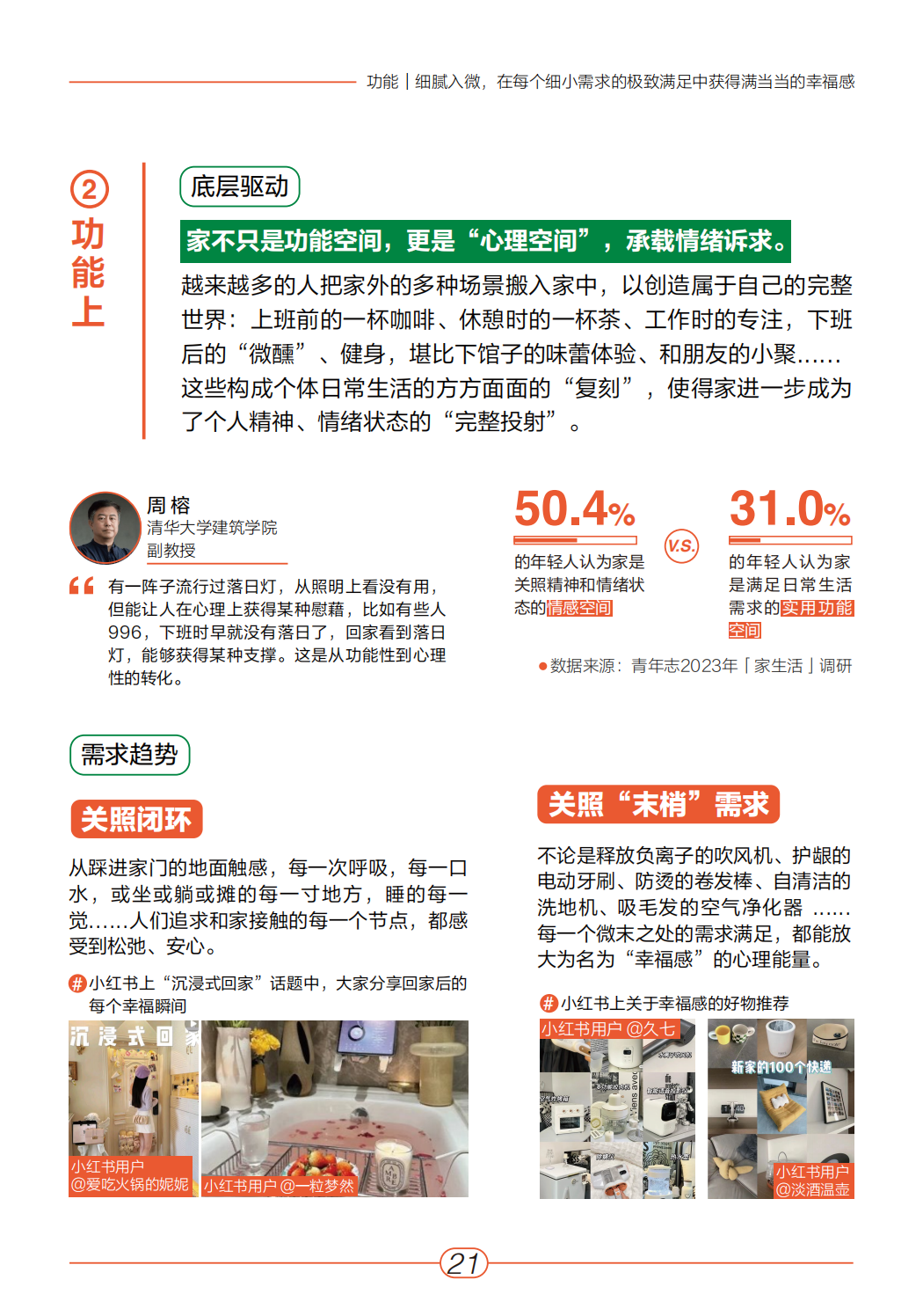 年轻人们分享着自己的「家生活」——宅家休憩、娱乐、工作、学习、社交、创造 / 创作,家务劳动……也记录和搜索着能够带来理想家生活的一切好物——大小家电、家居家具、电子数码等等。这些好物,既构成了「家生活」的“物”的基础,又提供着诸如美感、呵护感、便捷感、赋能感等情绪价值;它们与年轻人的生活方式、居住空间交织互动,共同谱写着「生活」之曲。