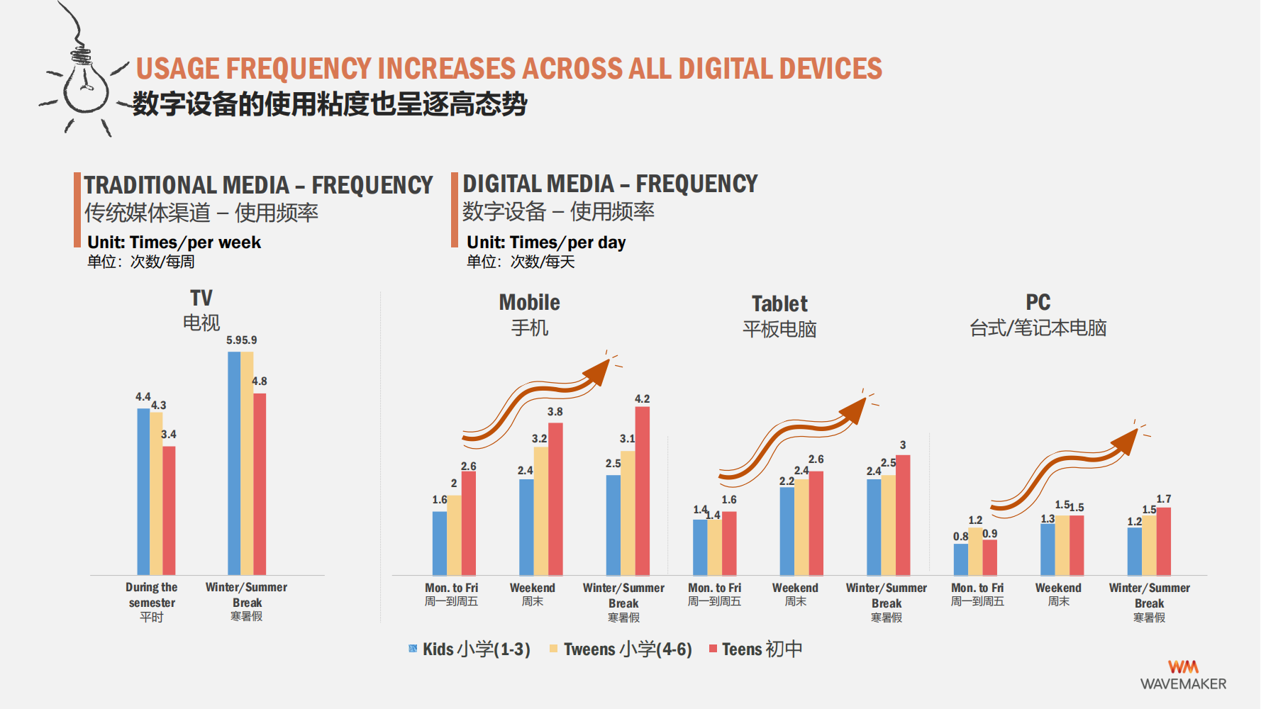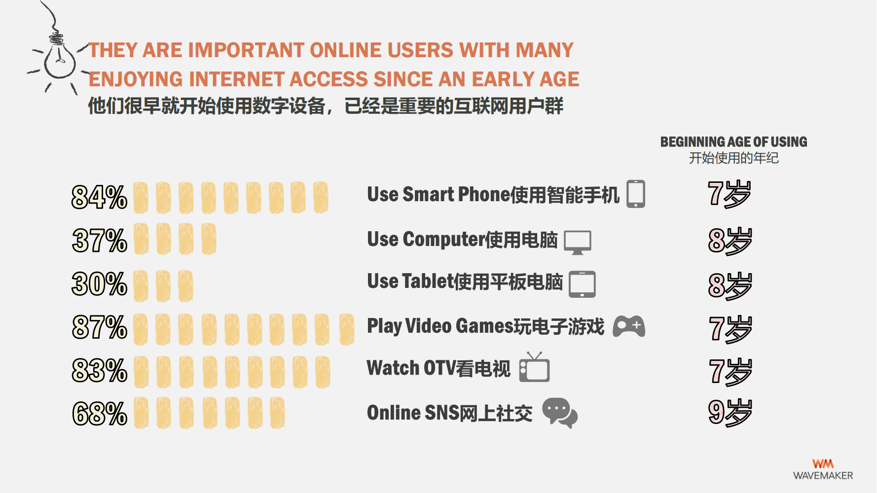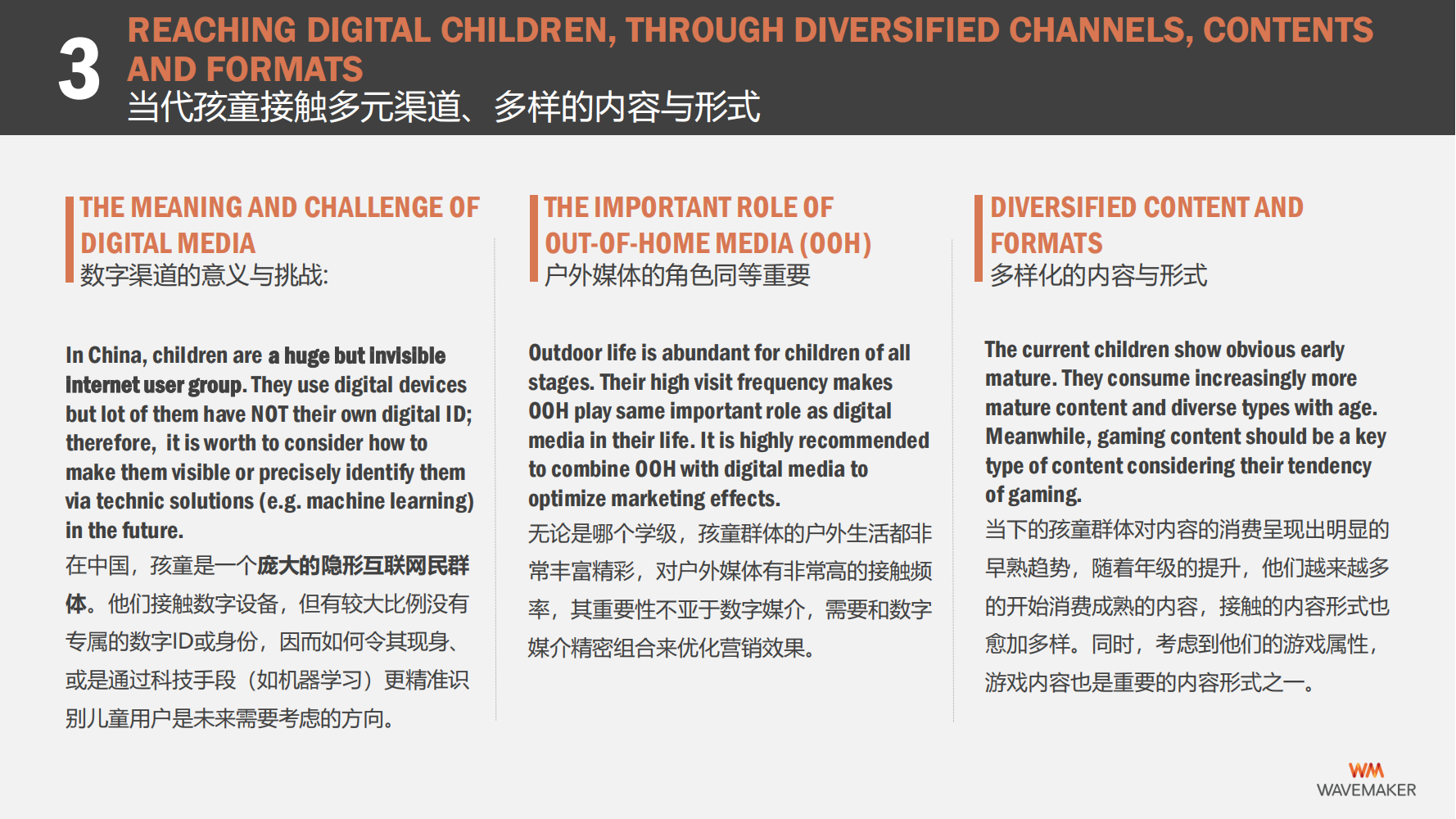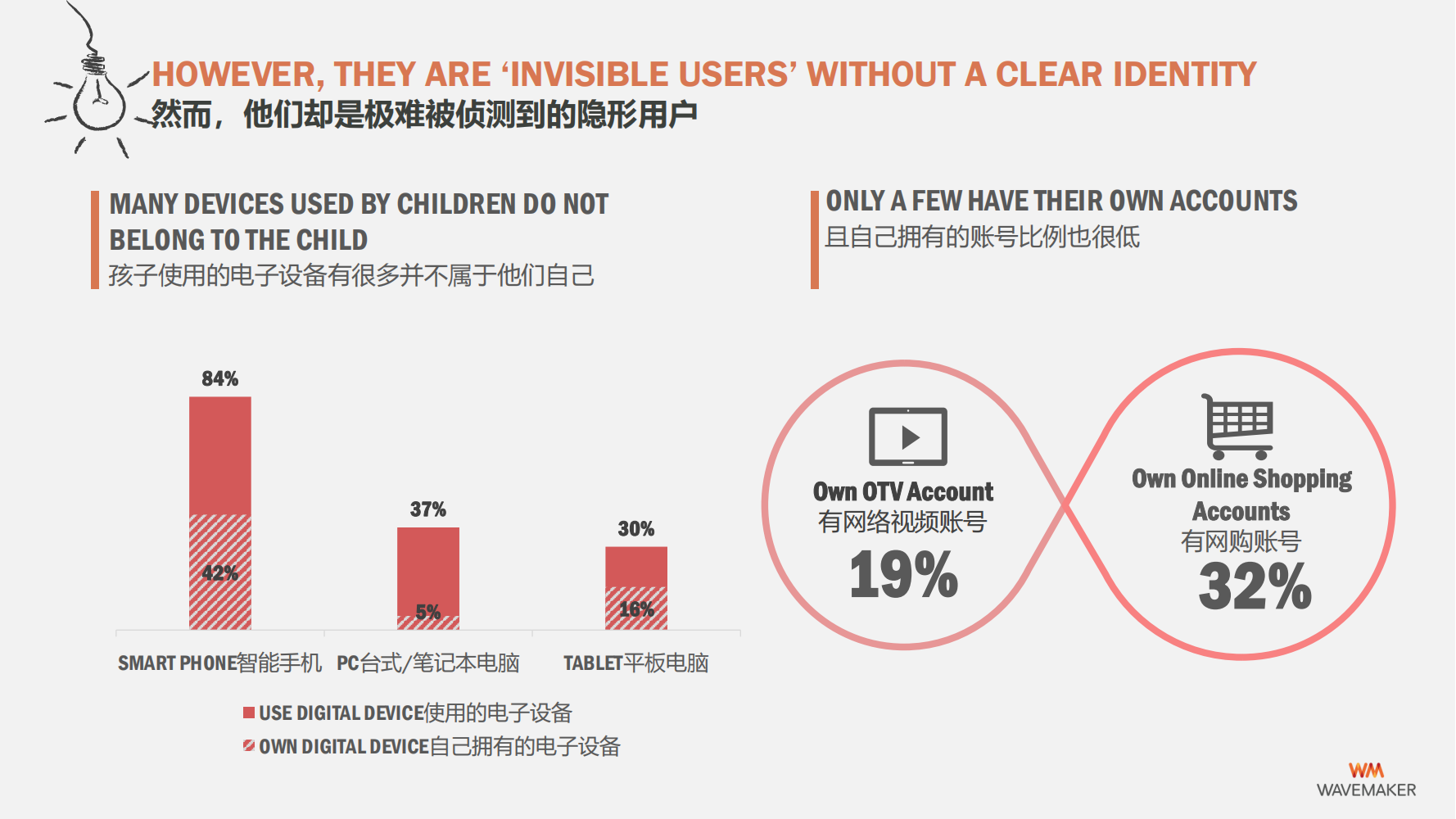 同时也要了解,孩童群体接触的渠道、内容与形式数字渠道的意义与挑战: 在中国,孩童是一个庞大的隐形互联网民群体,他们的数字设备接触度有目共睹;然而,因为他们中有较大比例没有专属的数字ID或身份,因而如何通过科技手段(如机器学习)更精准识别儿童用户是未来需要考虑的方向;
