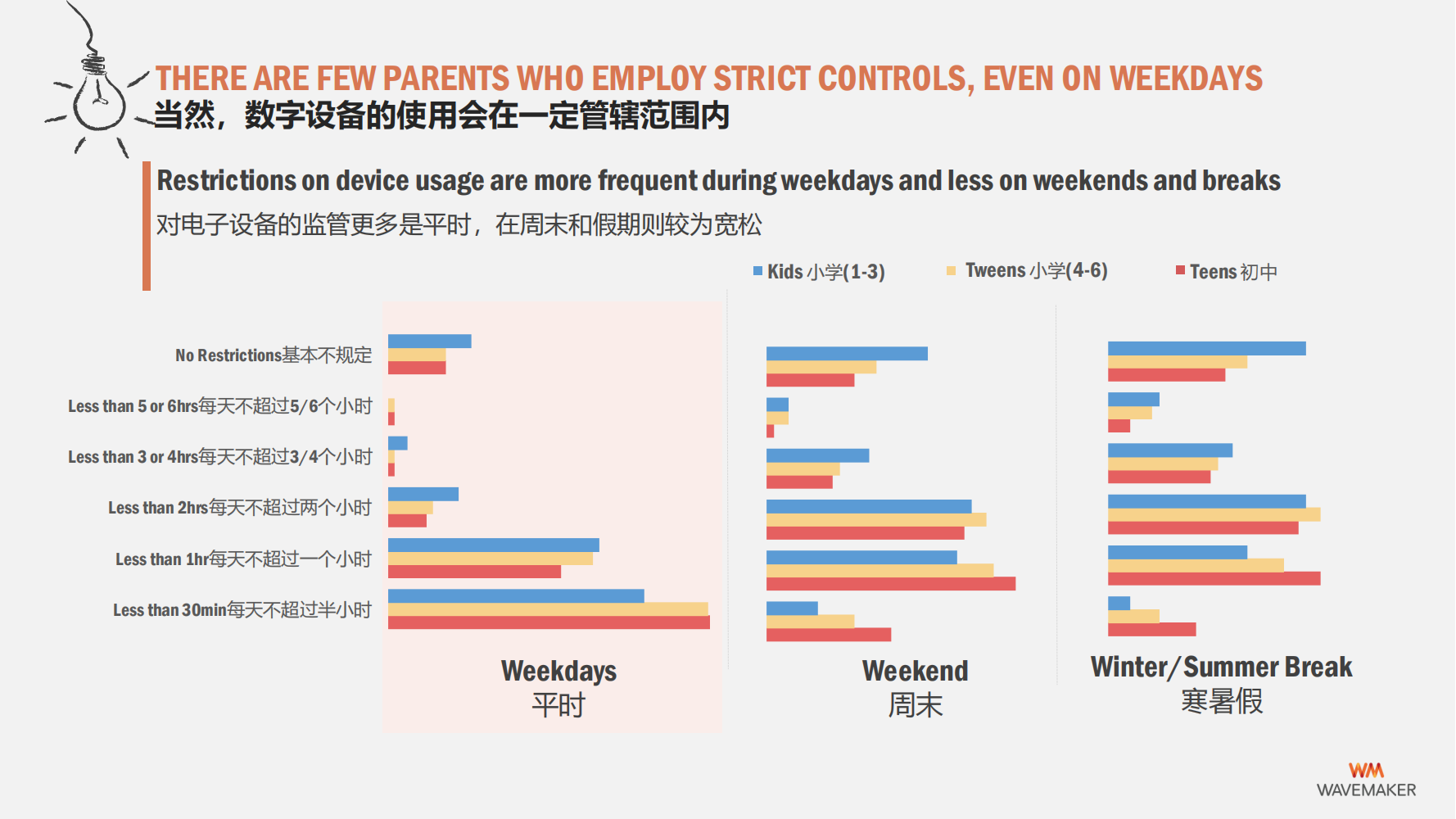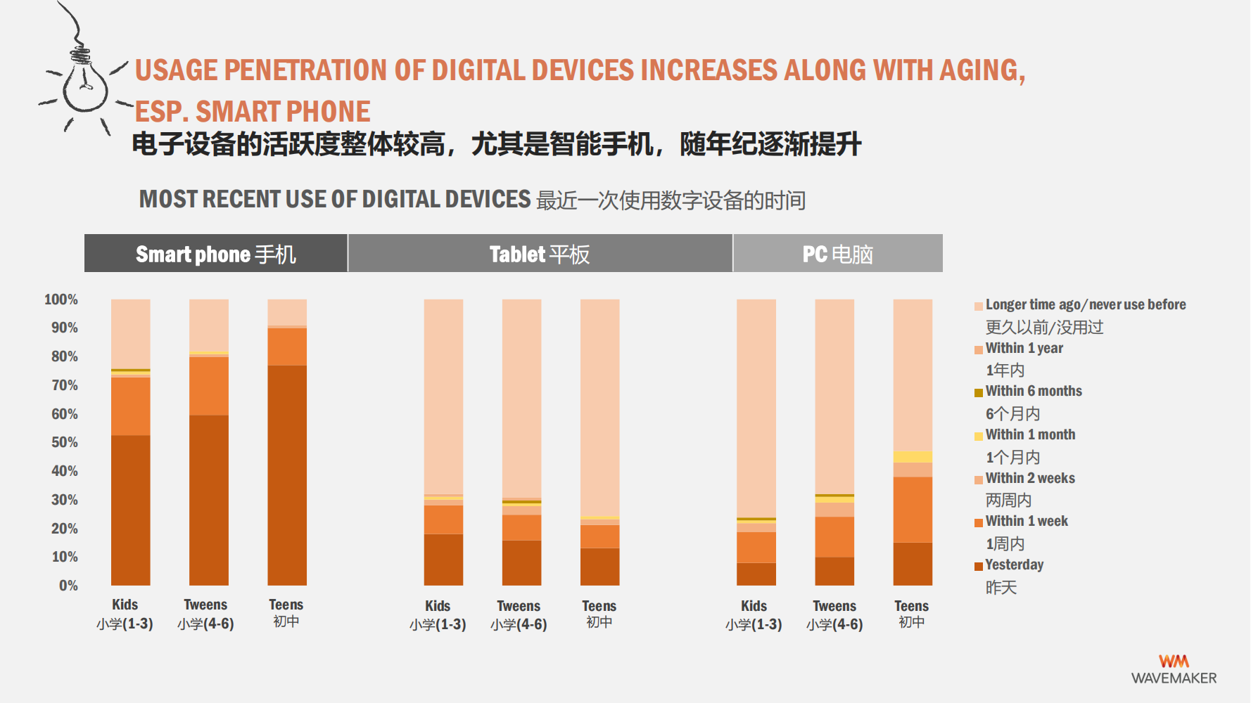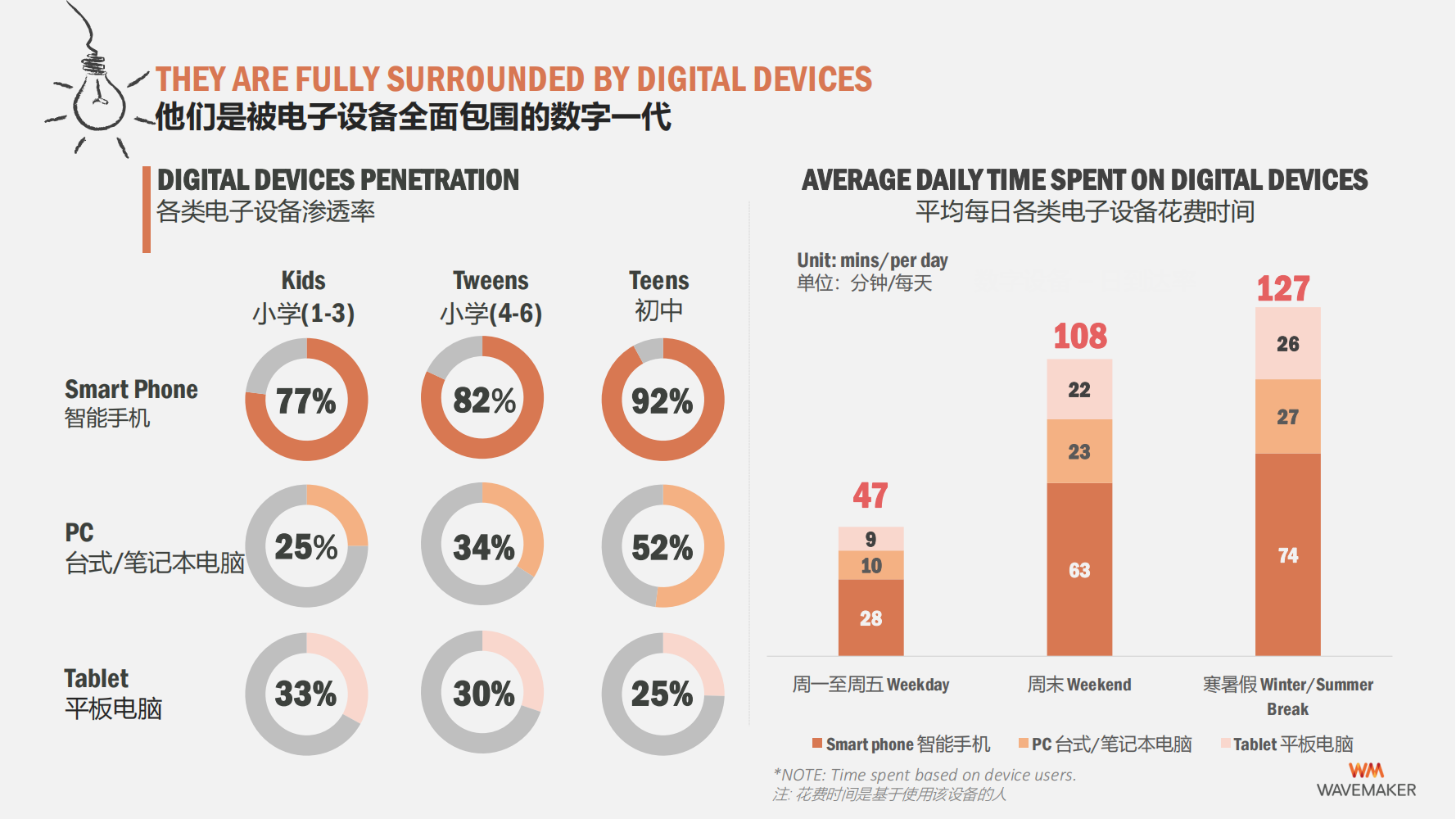 同时也要了解,孩童群体接触的渠道、内容与形式数字渠道的意义与挑战: 在中国,孩童是一个庞大的隐形互联网民群体,他们的数字设备接触度有目共睹;然而,因为他们中有较大比例没有专属的数字ID或身份,因而如何通过科技手段(如机器学习)更精准识别儿童用户是未来需要考虑的方向;