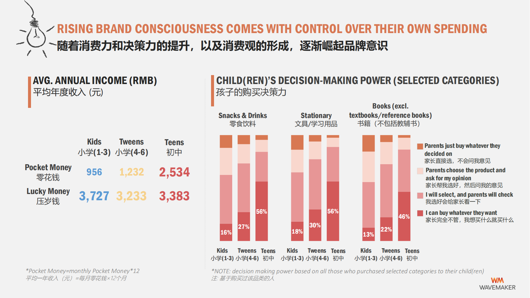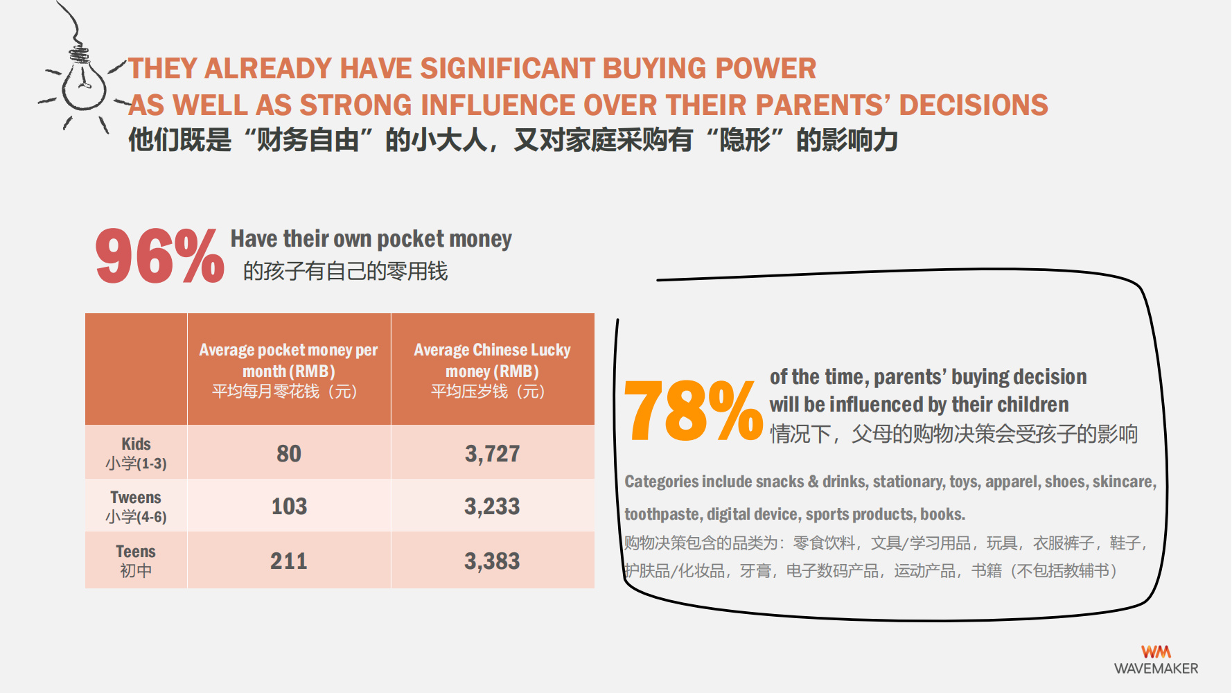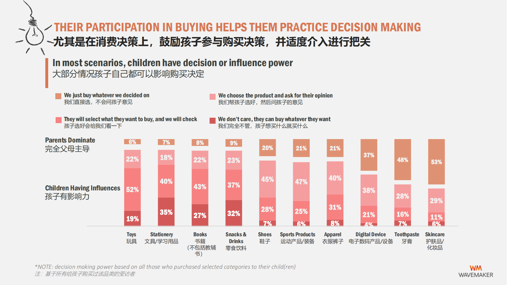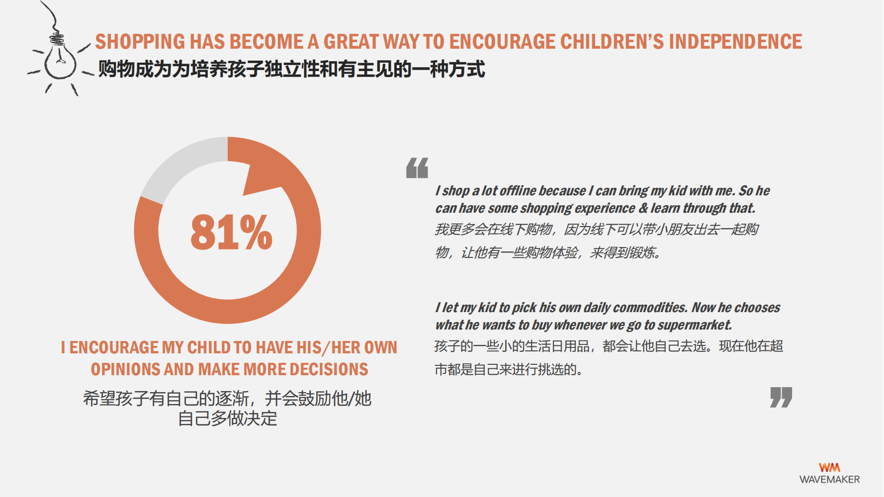 他们的“隐形”影响力: 受泛80后父母的育儿观影响,购物也是培养他们独立决策力的一种方式。他们已经对不同品类都有着不同程度的涉猎和影响,并使用父母的设备或账号来参与购物的过程;