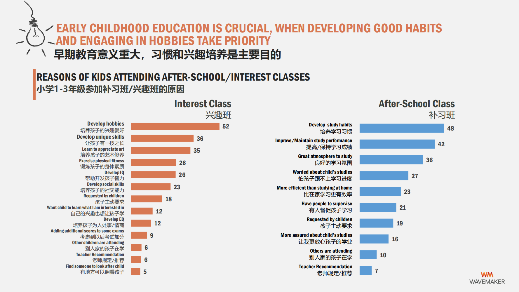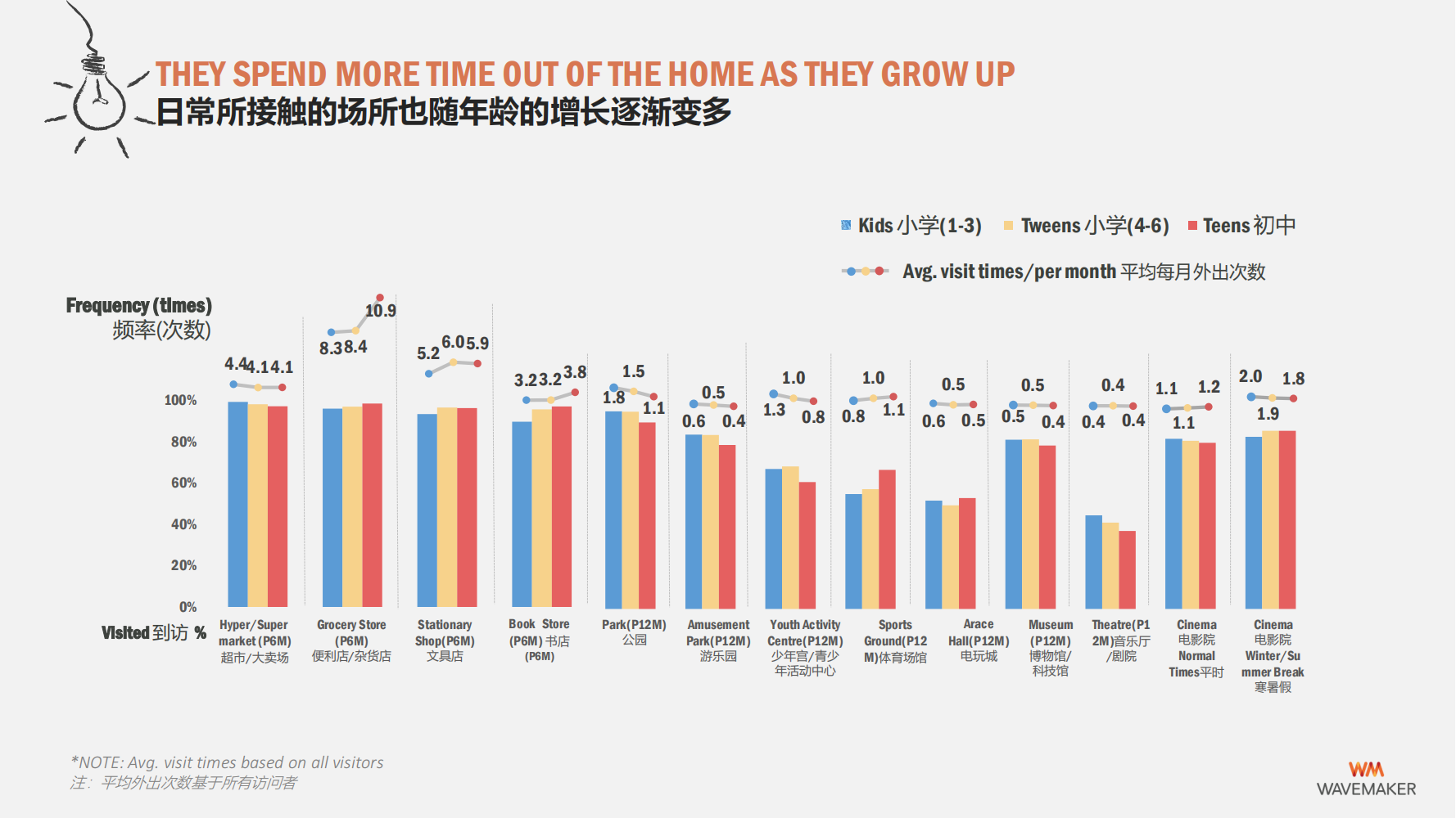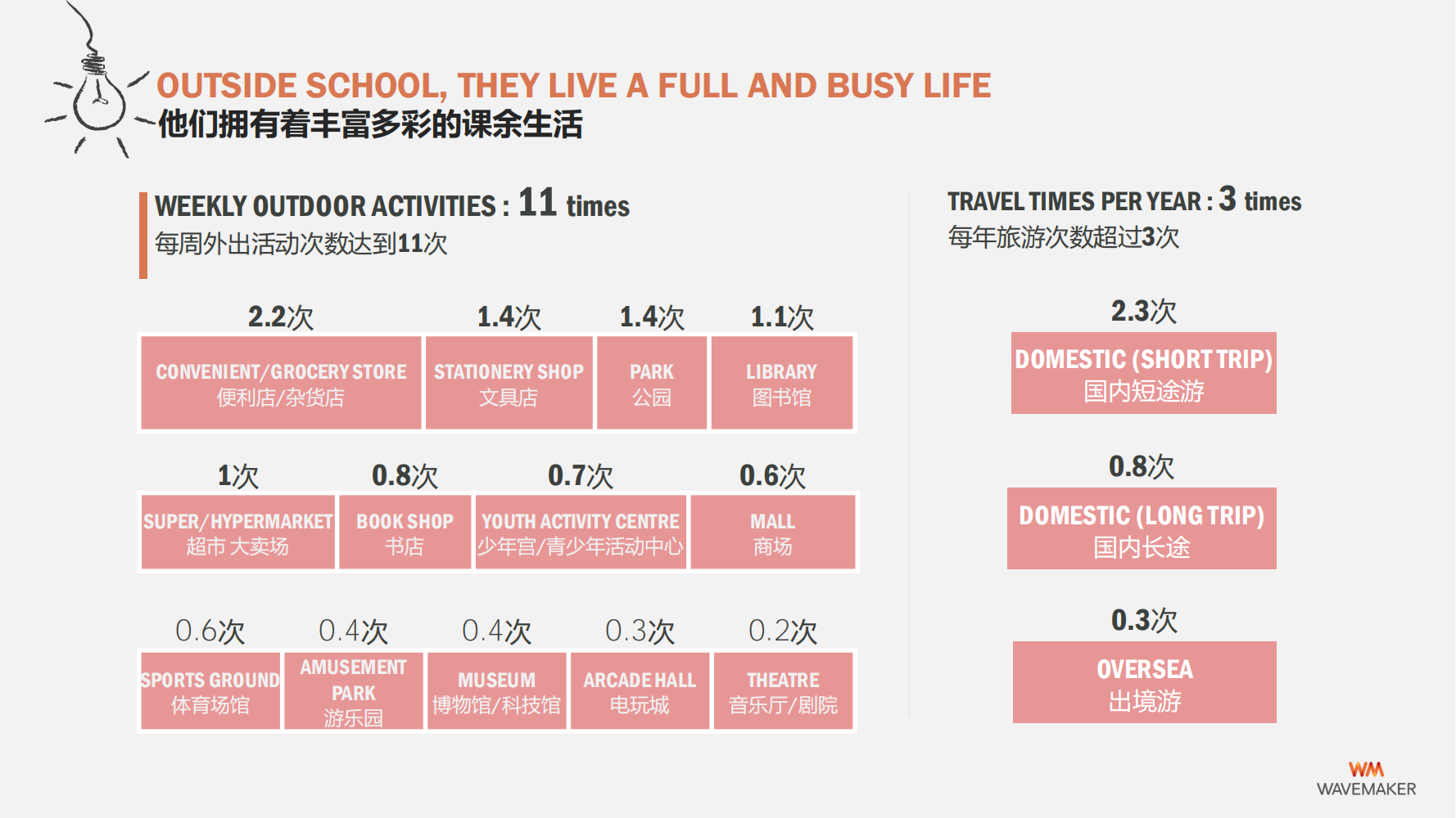 户外媒体的角色和数字媒体同等重要: 无论是哪个学级,孩童群体的户外生活都非常丰富精彩,对户外媒体有非常高的接触频率。户外媒体的重要性不亚于数字媒介,需要和数字媒介精密组合来优化营销效果;