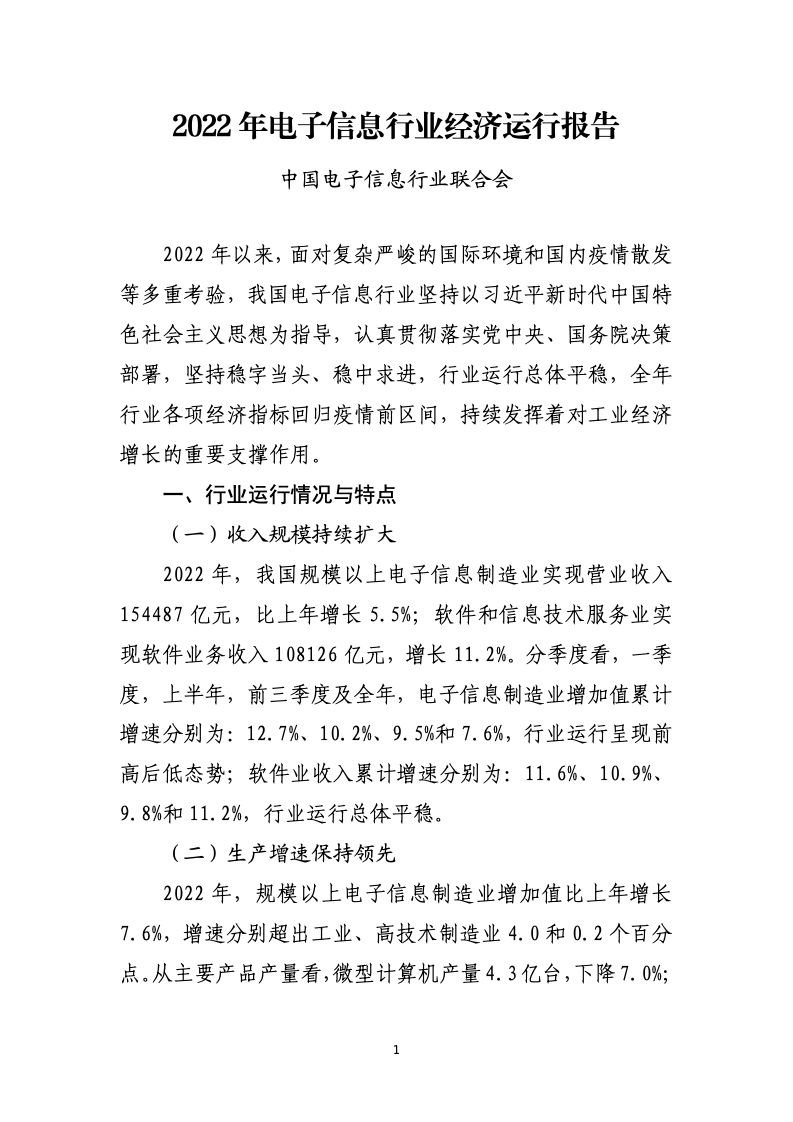 2022 年,我国规模以上电子信息制造业实现营业收入154487 亿元,比上年增长 5.5%;软件和信息技术服务业实现软件业务收入 108126 亿元,增长11.2%。分季度看,一季度,上半年,前三季度及全年,电子信息制造业增加值累计增速分别为:12.7%、10.2%、9.5%和7.6%,行业运行呈现前高后低态势;软件业收入累计增速分别为:11.6%、10.9%、9.8%和 11.2%,行业运行总体平稳。