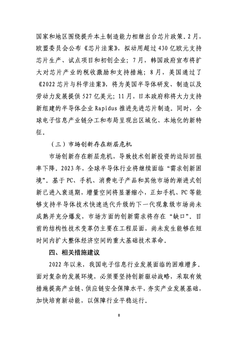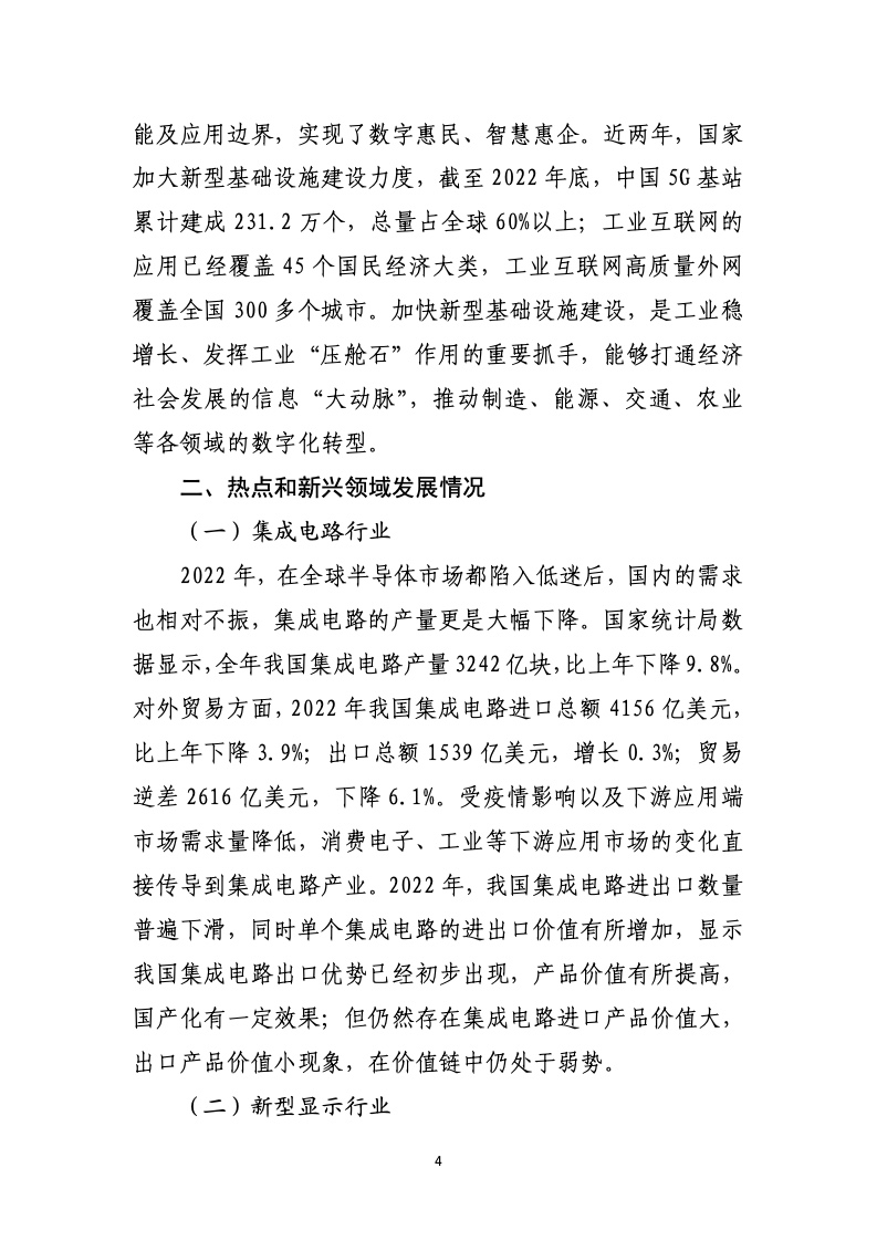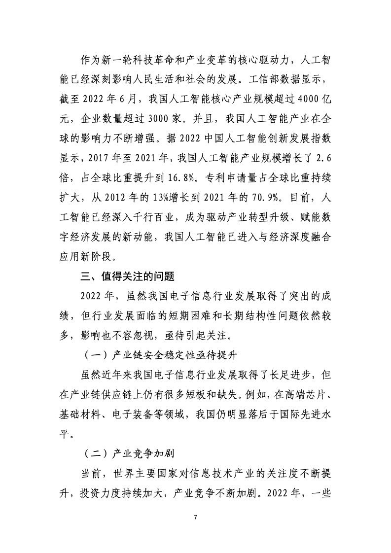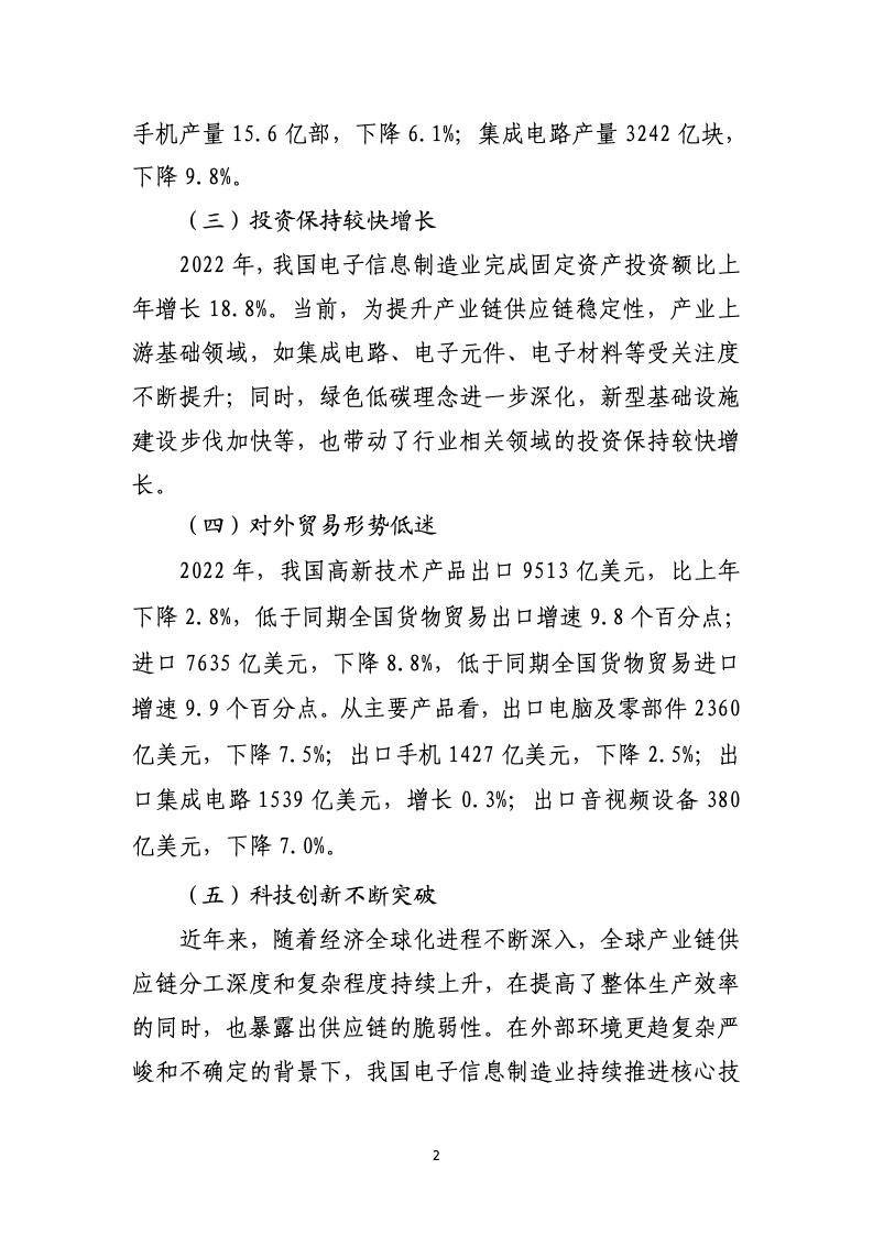 2022 年,规模以上电子信息制造业增加值比上年增长7.6%,增速分别超出工业、高技术制造业4.0 和0.2个百分点。从主要产品产量看,微型计算机产量4.3亿台,下降7.0%;手机产量 15.6 亿部,下降 6.1%;集成电路产量3242亿块,下降 9.8%。