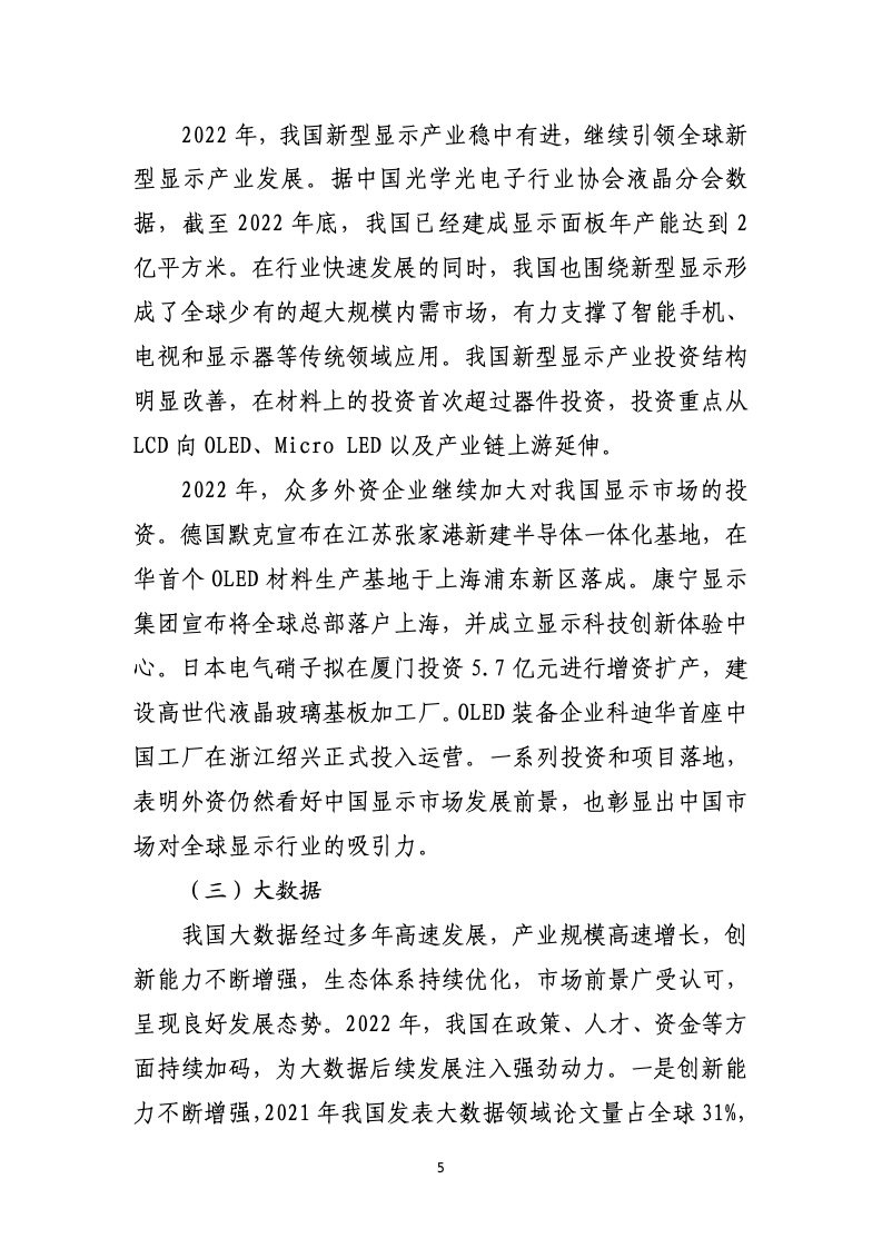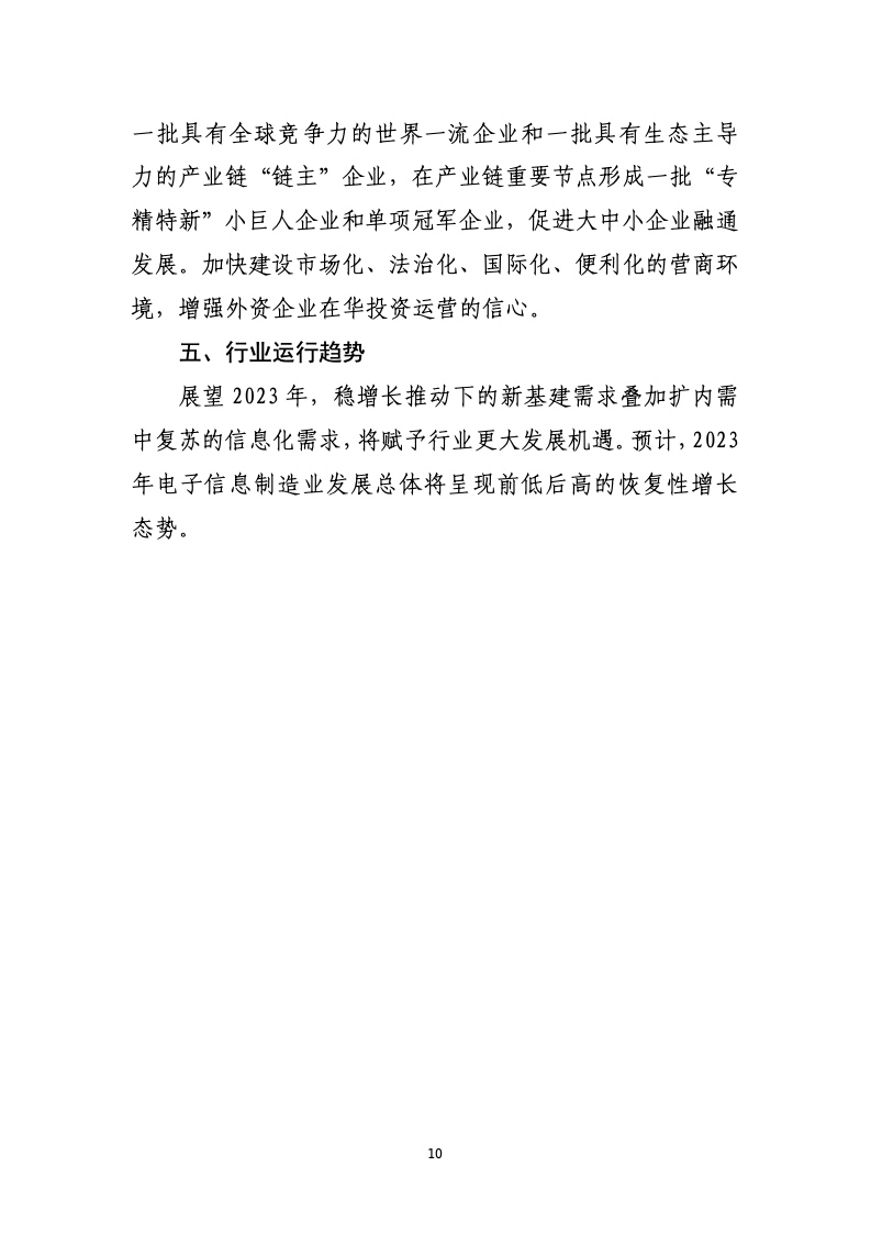 2022 年,我国电子信息制造业完成固定资产投资额比上年增长 18.8%。当前,为提升产业链供应链稳定性,产业上游基础领域,如集成电路、电子元件、电子材料等受关注度不断提升;同时,绿色低碳理念进一步深化,新型基础设施建设步伐加快等,也带动了行业相关领域的投资保持较快增长。