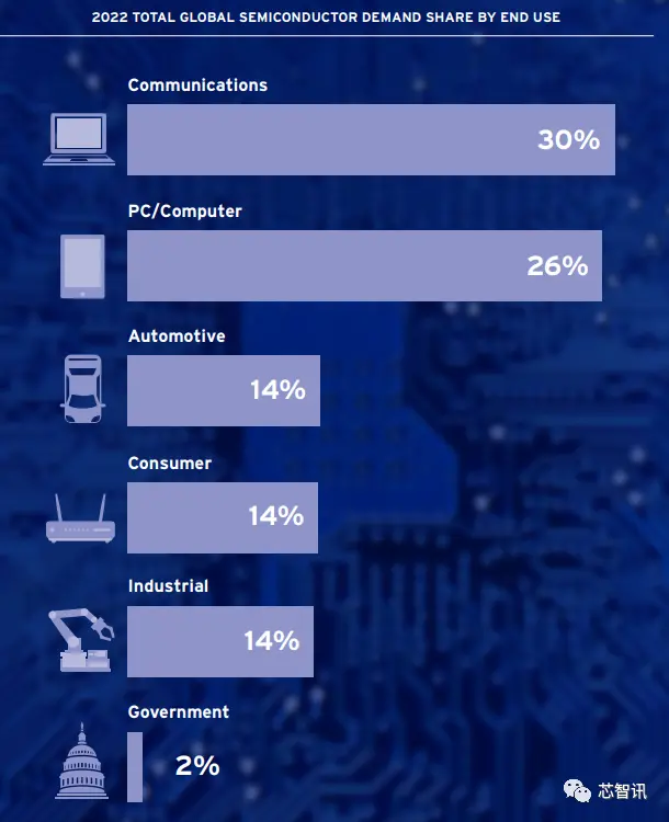 △从各应用领域在整个半导体市场份额来看,2022年通讯领域占比最高,达到了30%,随后分别是计算机(26%)、汽车(14%)、消费者(14%)、工业(14%)、政府(2%)。