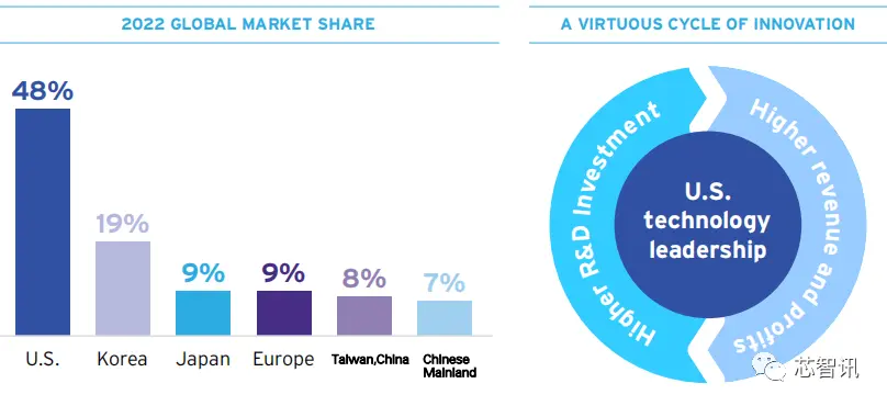 此外,美国半导体公司在研发、设计和制造工艺技术方面保持领先或高度竞争地位。全球销售市场份额的领先地位也使美国半导体行业受益于创新的良性循环。这就是销售领导地位使美国行业能够在研发方面进行巨额投资,这有助于确保美国销售继续处于领先地位。只要美国半导体行业保持全球市场份额领先地位,它将继续受益于这种创新的良性循环。