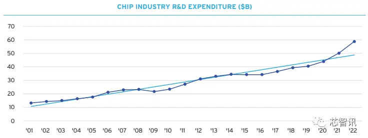 2000年至2020年美国半导体行业研发支出持续增长,到2022年,美国半导体行业的研发投资总额已经达到了588亿美元,年复合增长率约为6.7%。无论年销售情况如何,美国半导体公司的研发支出往往居高不下,这反映了投资研发对半导体生产的重要性。